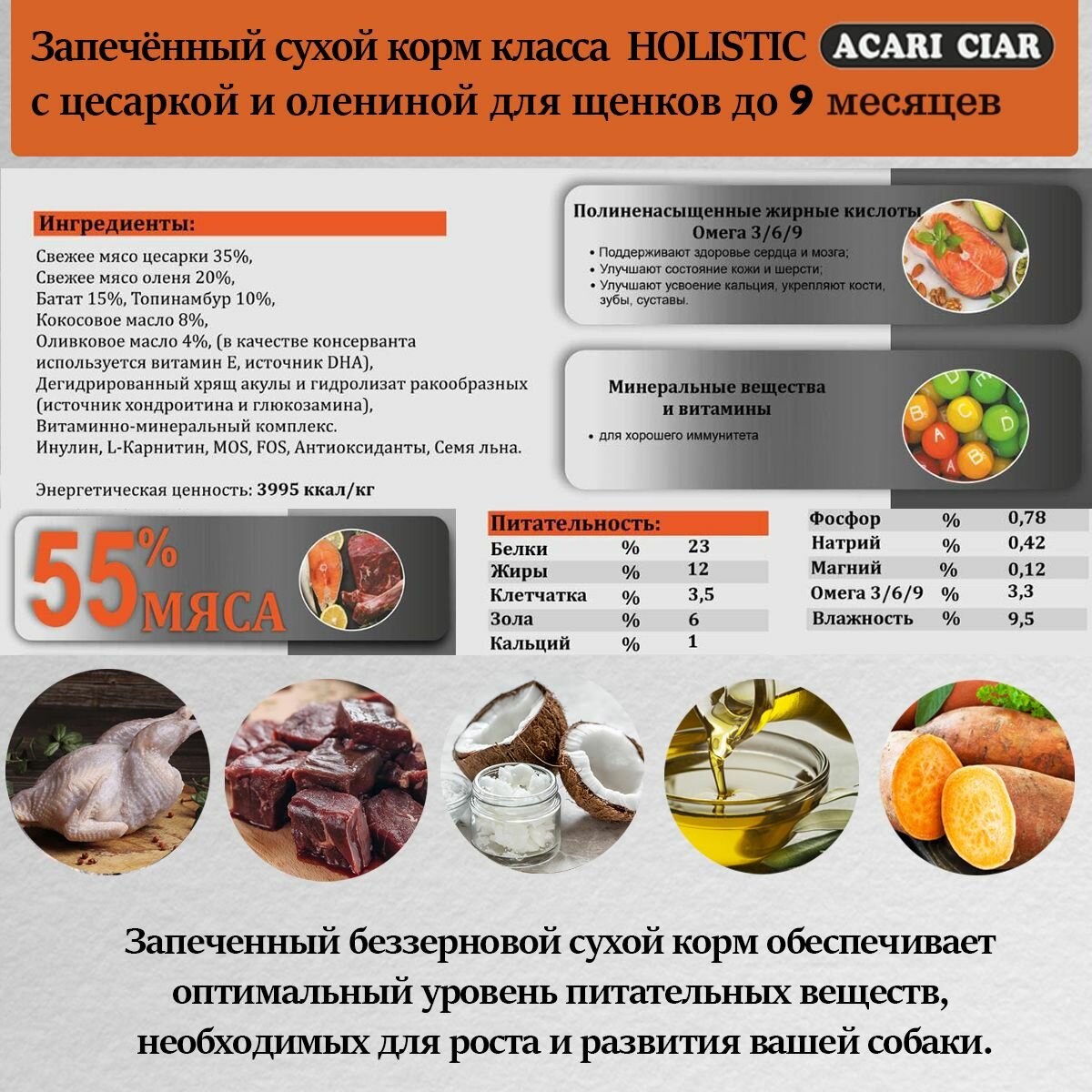 Запеченный сухой корм для щенков Acari Ciar A Baked Junior с цесаркой и олениной - это сбалансированный и полнорационный корм класса холистик, созданный на основе рекомендаций ведущих ветеринарных врачей, кинологов и заводчиков России.