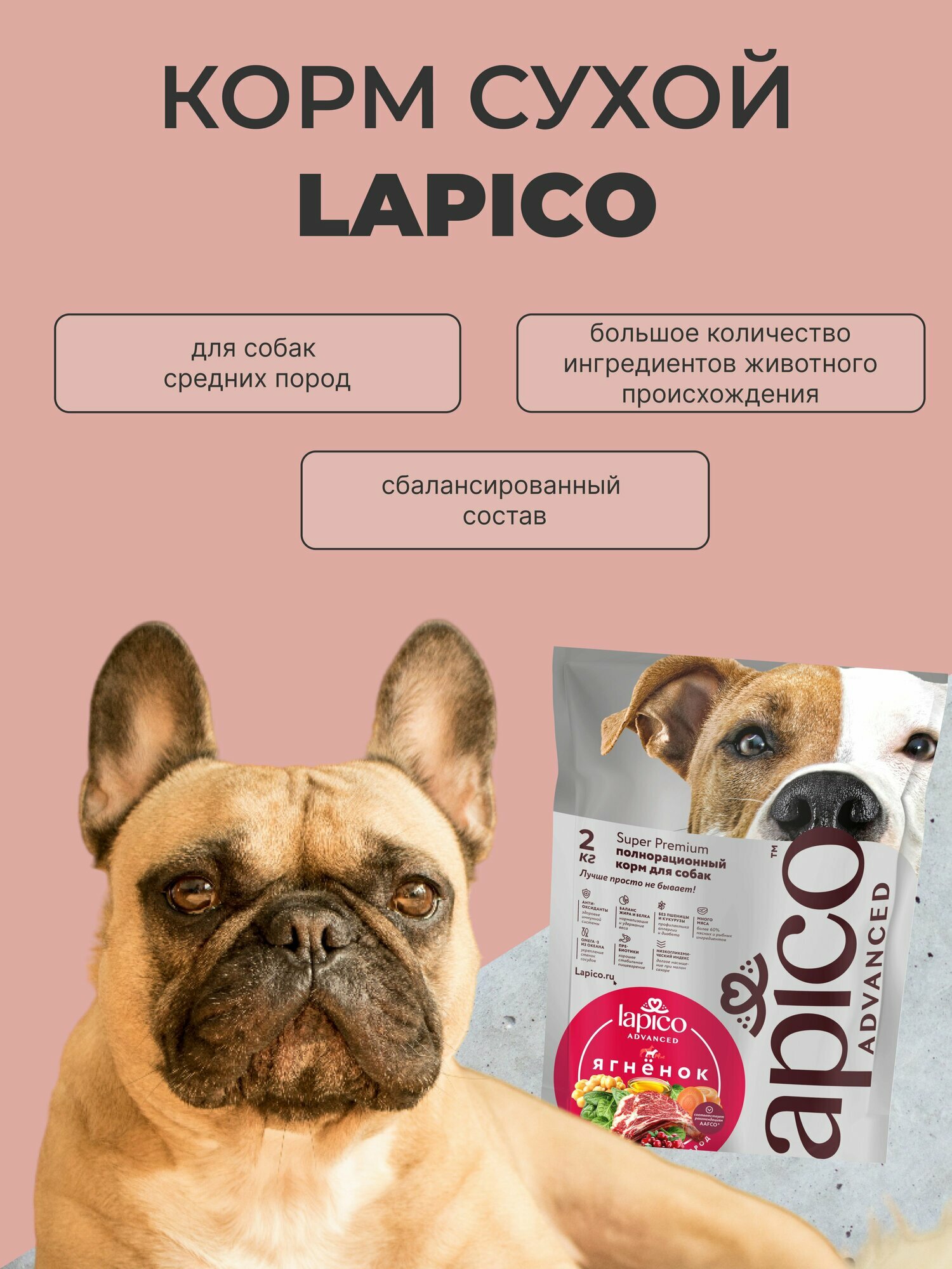 Корм сухой для собак средних пород Lapico ADVANCED Ягненок. Состав: Баранина 41,3% (дегидратированная баранина 29%, свежая баранина 12,3%), ячмень, нут, цельное яйцо, жир бараний 10,4%, дегидратированная белая рыба 5%, масло сельди 3%, рисовые отруби (источник клетчатки), красная чечевица, сушеная морковь, сушеная тыква, сушеный цуккини, водоросли, клюква, шпинат, юкка Шидигера, экстракт расторопши, пребиотик MOS, пребиотик FOS, экстракт розмарина, витаминно-минеральный комплекс.
