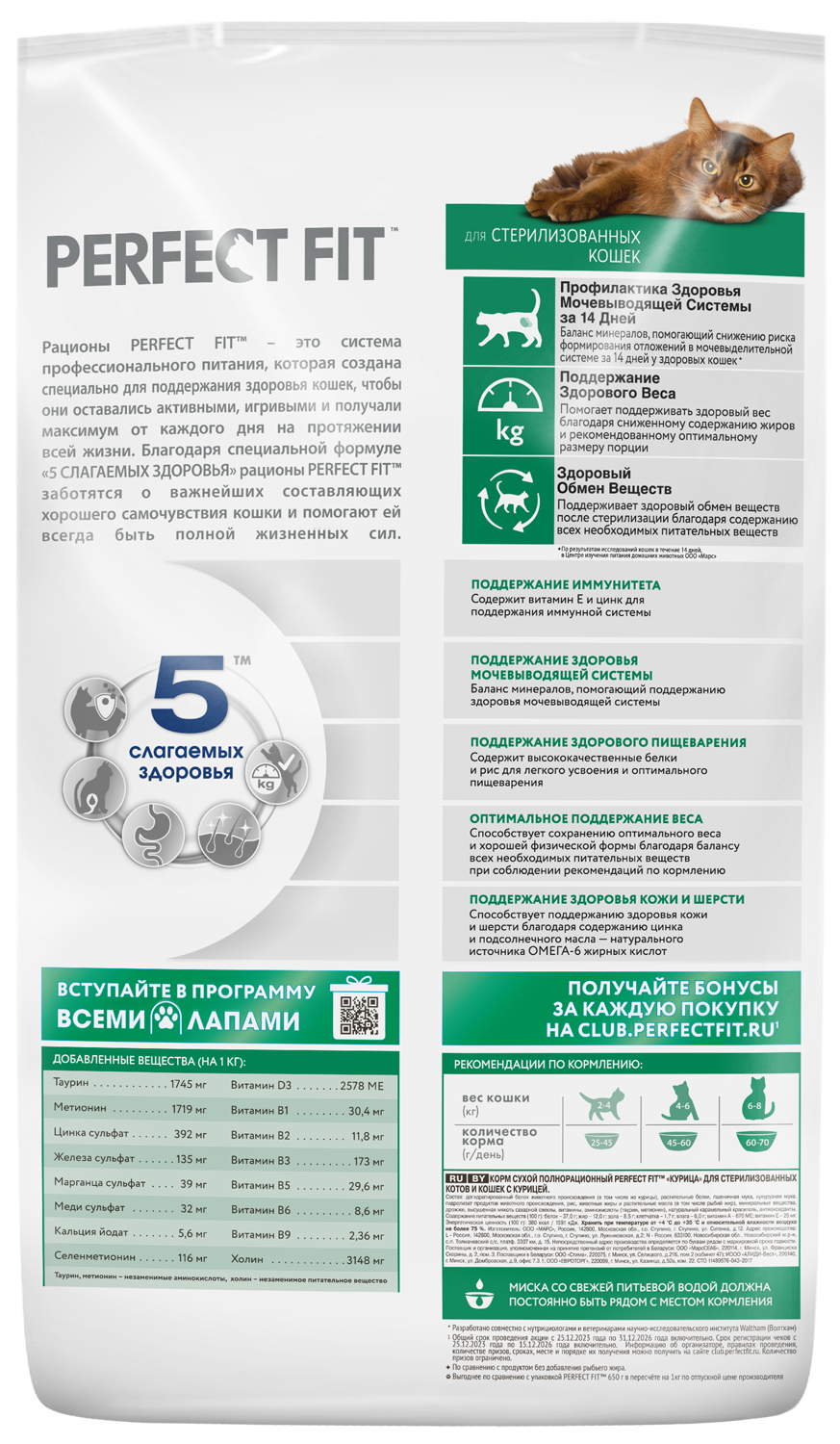 Сухой корм PERFECT FIT с курицей для стерилизованных кошек всех пород 10 кг – это профессиональный рацион для взрослых кошек, живущих в помещении. Благодаря пониженному содержанию жира, этот корм следит за балансом веса питомца по сравнению с PERFECT FIT Adult.