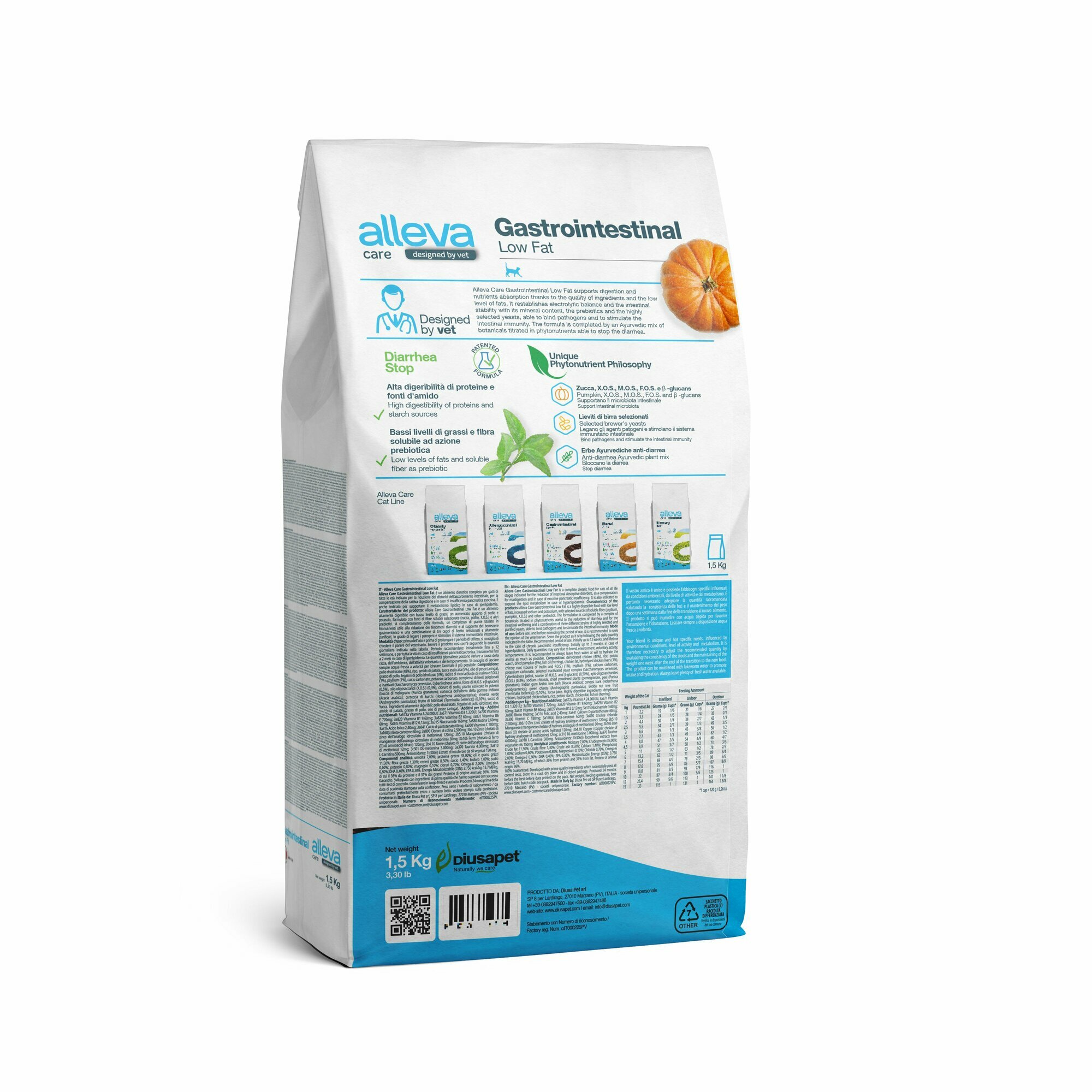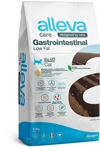 Alleva Care Gastrointestinal Low Fat - это высоко усваиваемый рацион с низким содержанием жиров, повышенным содержанием натрия и калия, с отборной растворимой клетчаткой (тыква, подорожник, ксилоолигосахариды (X.O.S)) и другими пребиотиками. В состав корма входит комплекс растительных компонентов - фитонутриентов, полезных для нормализации процессов пищеварения и улучшения здоровья кишечника, а также комбинация трех различных штаммов тщательно отобранных и очищенных дрожжей, которые отвечают за стимуляцию иммунной системы в борьбе с патогенами и за восстановление оптимальной работы кишечника.