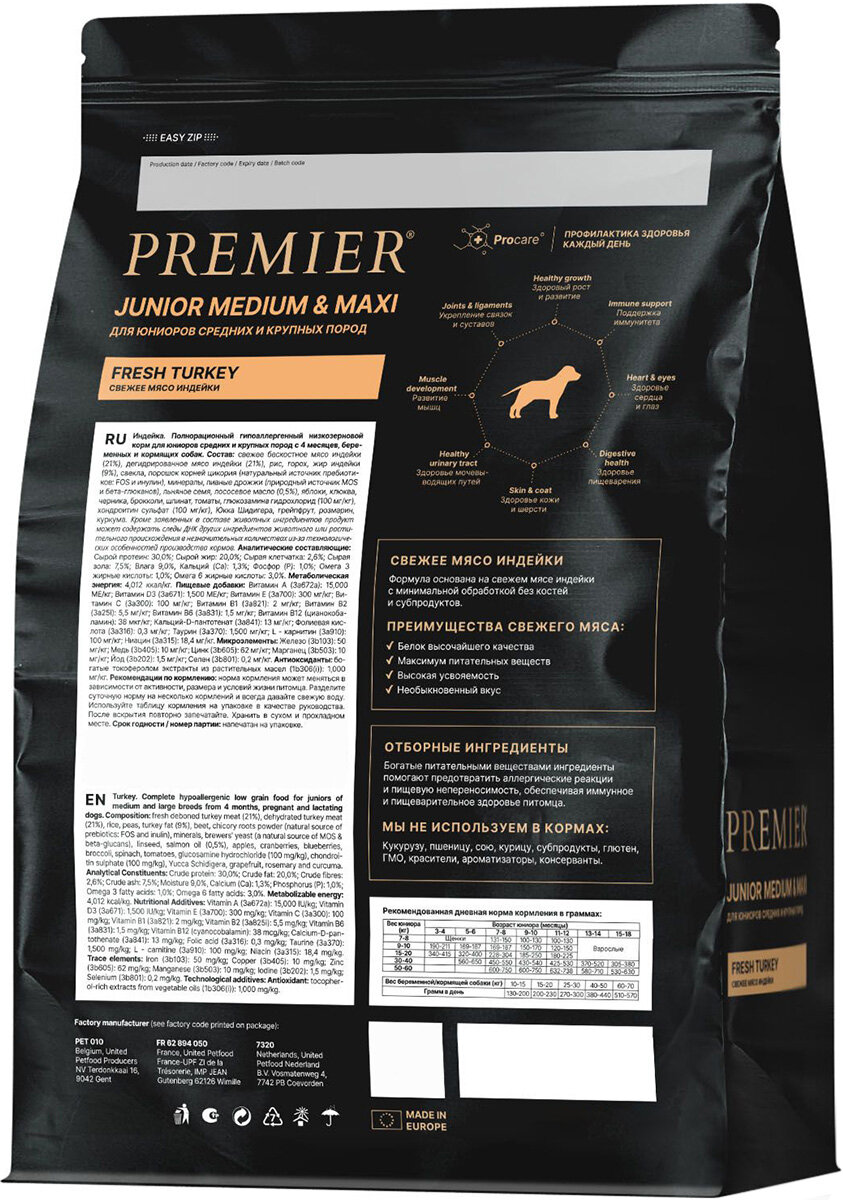 Полнорационный сухой корм супер-премиум класса на основе свежего мяса индейки для юниоров средних и крупных пород с 4 месяцев, беременных и кормящих собак.