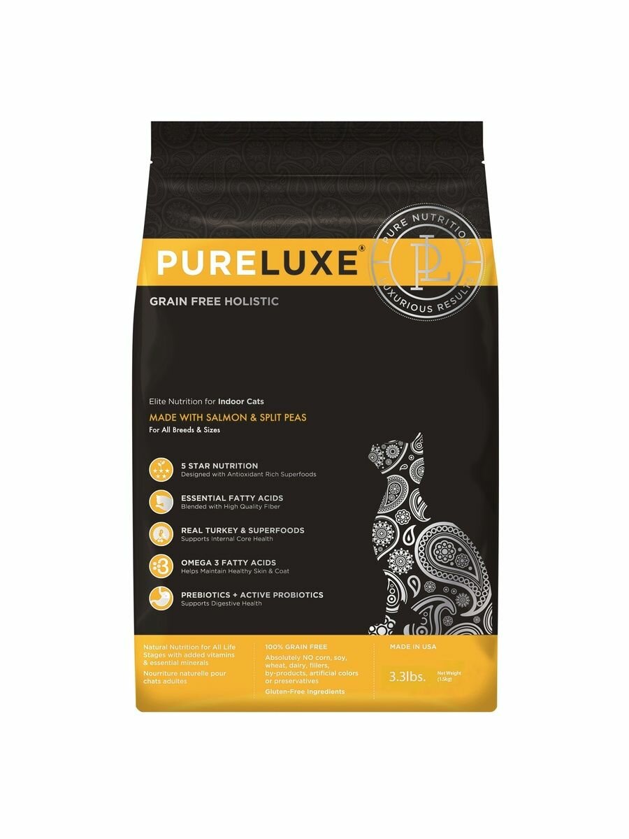 PureLuxe Elite Nutrition for indoor cats with salmon & split peas – питание холистик класса, не содержит злаков. Свежее диетическое филе индейки легко усваивается и гарантирует великолепный вкус. Корм подойдёт для кошек с чувствительной пищеварительной системой. Обогащённый пищевыми волокнами состав помогает вывести проглоченную шерсть, а также способствует поддержанию нормального веса. В рационе отсутствуют: мясо курицы, говядина, молочные продукты, свёкла, кукуруза, соя, искусственные антиоксиданты, консерванты, красители и усилители вкуса. Благодаря уникальной комбинации активных пробиотиков и энзимов увеличивается усвояемость питательных веществ и нормализуется работа пищеварительной системы. Входящая в состав юкка Шидигера способствует уменьшению запаха фекалий. Особое внимание уделено здоровью мочевыделительной системы: оптимальное содержание минералов и добавка клюквы (которая подкисляет мочу и обладает бактерицидными и противовоспалительными свойствами) эффективно профилактируют мочекаменную болезнь. В состав корма входят глюкозамин и хондроитин для защиты суставов. Оптимальный баланс натуральных антиоксидантов и омега-3 жирных кислот эффективно поддерживает работу иммунной системы и способствует борьбе с воспалениями, что имеет особое значение при проживании в неблагоприятных экологических условиях. Корм PureLuxe - лучший выбор для городского питомца!