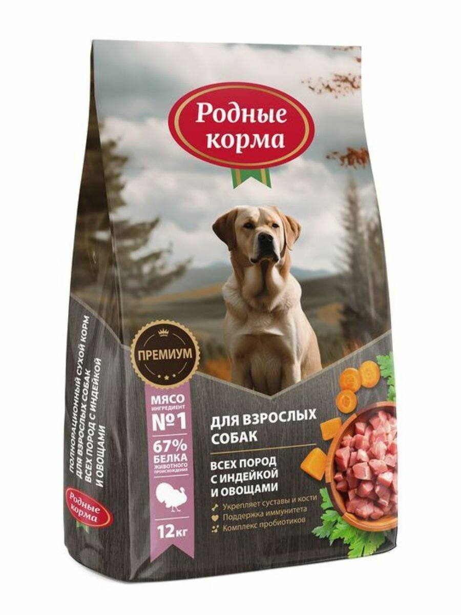 Родные корма Полнорационный сухой корм для взрослых собак всех пород, с индейкой и овощами — 12 кг: сравнение цен, характеристики, фото, актуальное наличие и цены.
