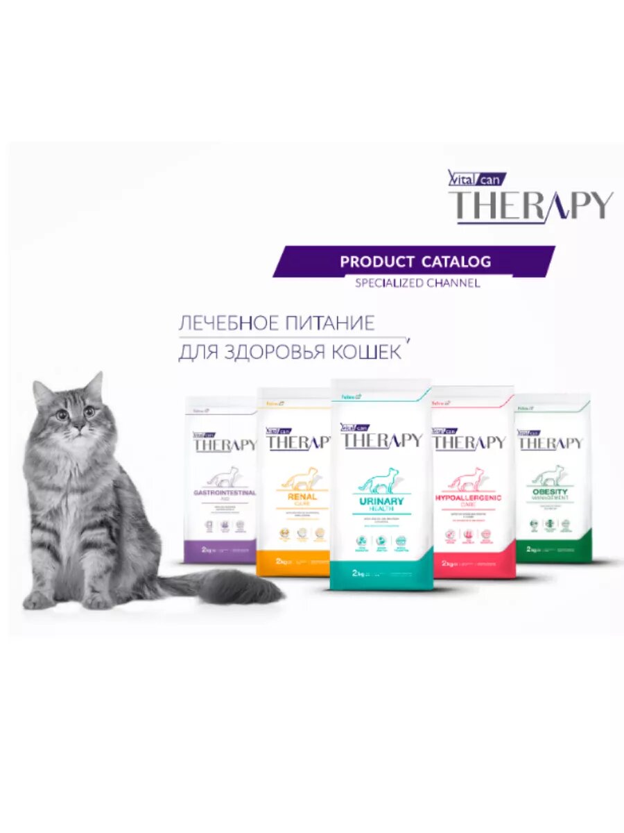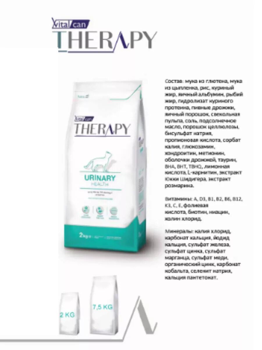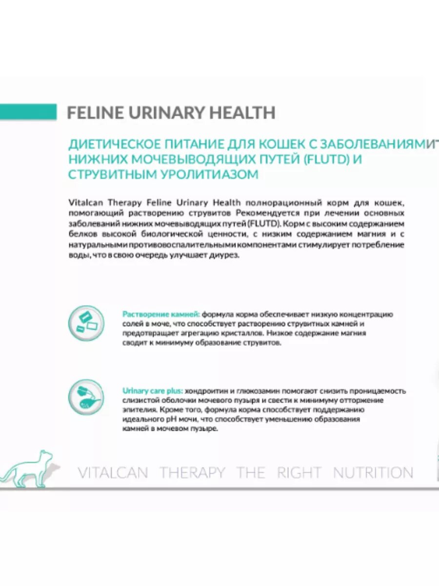 Vitalcan Therapy Feline Urinary Health полнорационный корм для кошек, помогающий растворению струвитов Рекомендуется при лечении основных заболеваний нижних мочевыводящих путей (FLUTD). Корм с высоким содержанием белков высокой биологической ценности, с низким содержанием магния и с натуральными противовоспалительными компонентами стимулирует потребление воды, что в свою очередь улучшает диурез.
