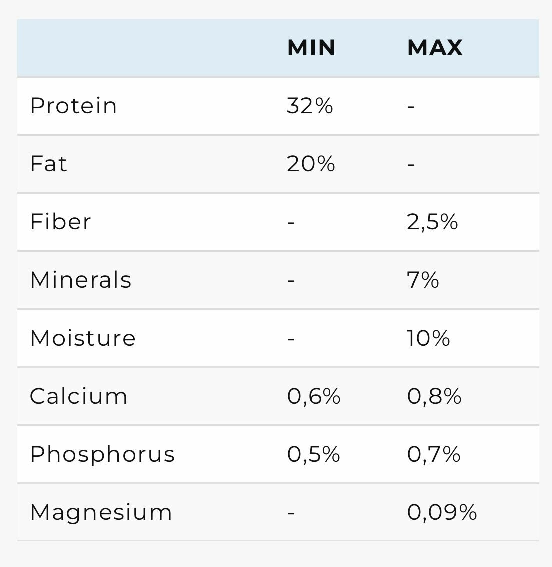 Мука из цыпленка, рис, яичный порошок, куриный жир, яичный альбумин, крахмал из маниоки, свекольная пульпа, рыбий жир, гидролизат куриного протеина, пивные дрожжи, подсолнечное масло, цеолит, соль, порошок целлюлозы, бисульфат натрия, метионин, пропионовая кислота, сорбат калия, оболочки дрожжей, таурин, BHA, BHT, TBHQ, лимонная кислота, экстракт Юкки Шидигера, глютамин, артишок, экстракт розмарина.
