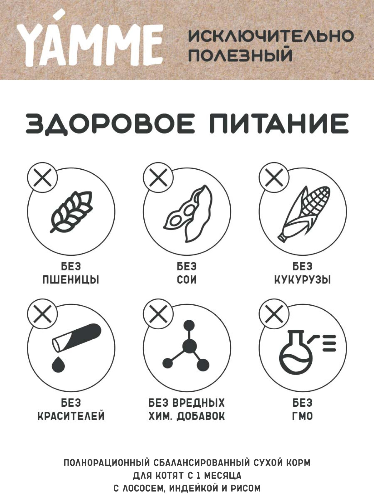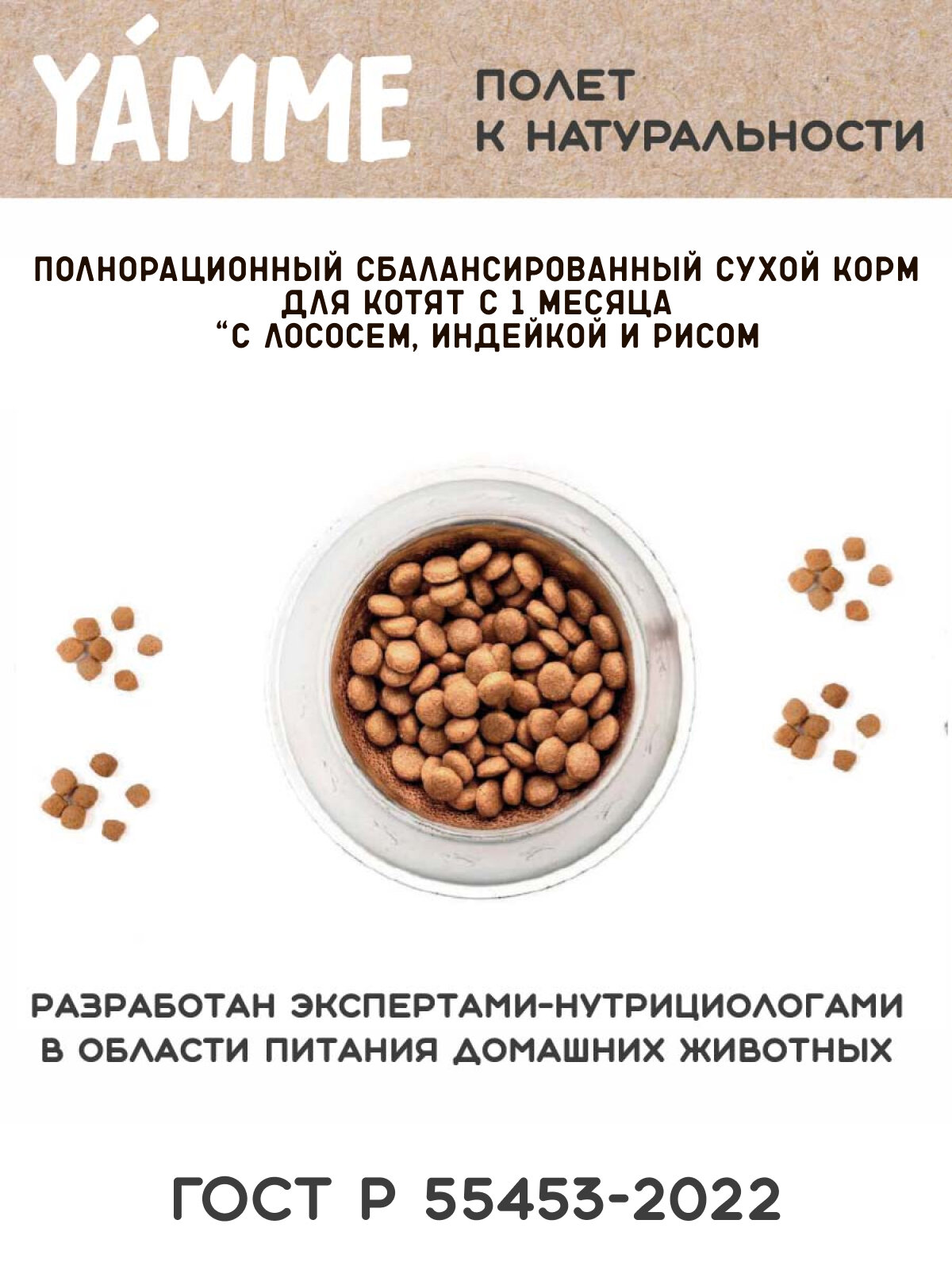 YÁMME - гипоаллергенное натуральное питание для котят с 1 месяца всех пород. Индейка, лосось, цельнозерновой рис.