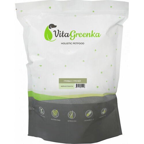 Vitagreenka Грибы с гречей мелкая гранула это этичный корм. В нем нет продуктов, имеющих животное происхождение. В нем предлагается расширенное соединение растительных компонентов, дополненное семенами Чиа, кунжутом черным, и, безусловно, фирменной специальной белковой добавкой из внетаксономического класса грибов Saccharomyces cerevisiae и грибов Шиитаке. Состав: протеин 26 %, жир 12 %, зола 8 %, клетчатка 7 %, кальций 1 %, фосфор 0,5 %, влажность 10 %, энергетическая ценность на 1 кг: 3750 ккал. Ингредиенты: добавка белковая из внетаксономической группы грибов Saccharomyces cerevisiae, грибы Шиитаке, органическая фасоль, нут, цельная греча, свежая морковь, свежий кабачок, спирулина, сушеные плоды шиповника, пивные дрожжи, сушеные яблоки, амарант, базилик, пастернак, льняное масло, экстракт цикория, мука из клубня топинамбура, семена Чиа, крапива, бархатцы прямостоячие (источник лютеина), сушеные бананы, сушеная черника, ряска, сушеная клюква, хвойная мука, Юкка Шидигера, органические натуральные ароматизаторы, Мико Карб, смесь экстрактов куркумы, сизигиума, розмарина и грейпфрута в качестве природных антиоксидантов.