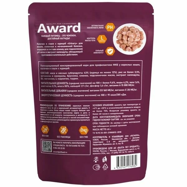 Корм для кошек Award Urinary представляет собой влажный корм в виде кусочков в соусе с курицей. Он разработан специально для взрослых кошек и предназначен для профилактики мочекаменной болезни.