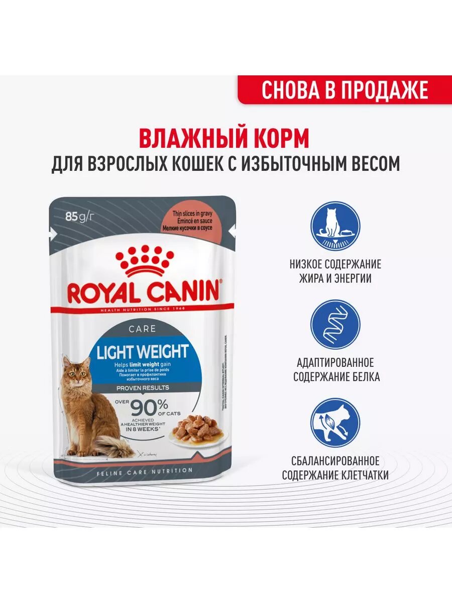 Продукт также содержит вещества, способствующие здоровью и нормальной работе мочевыделительной системы. Для удовлетворения индивидуальных предпочтений каждой кошки ROYAL CANIN®Light Weight Care выпускается также в виде сухого корма Light Weight Care.