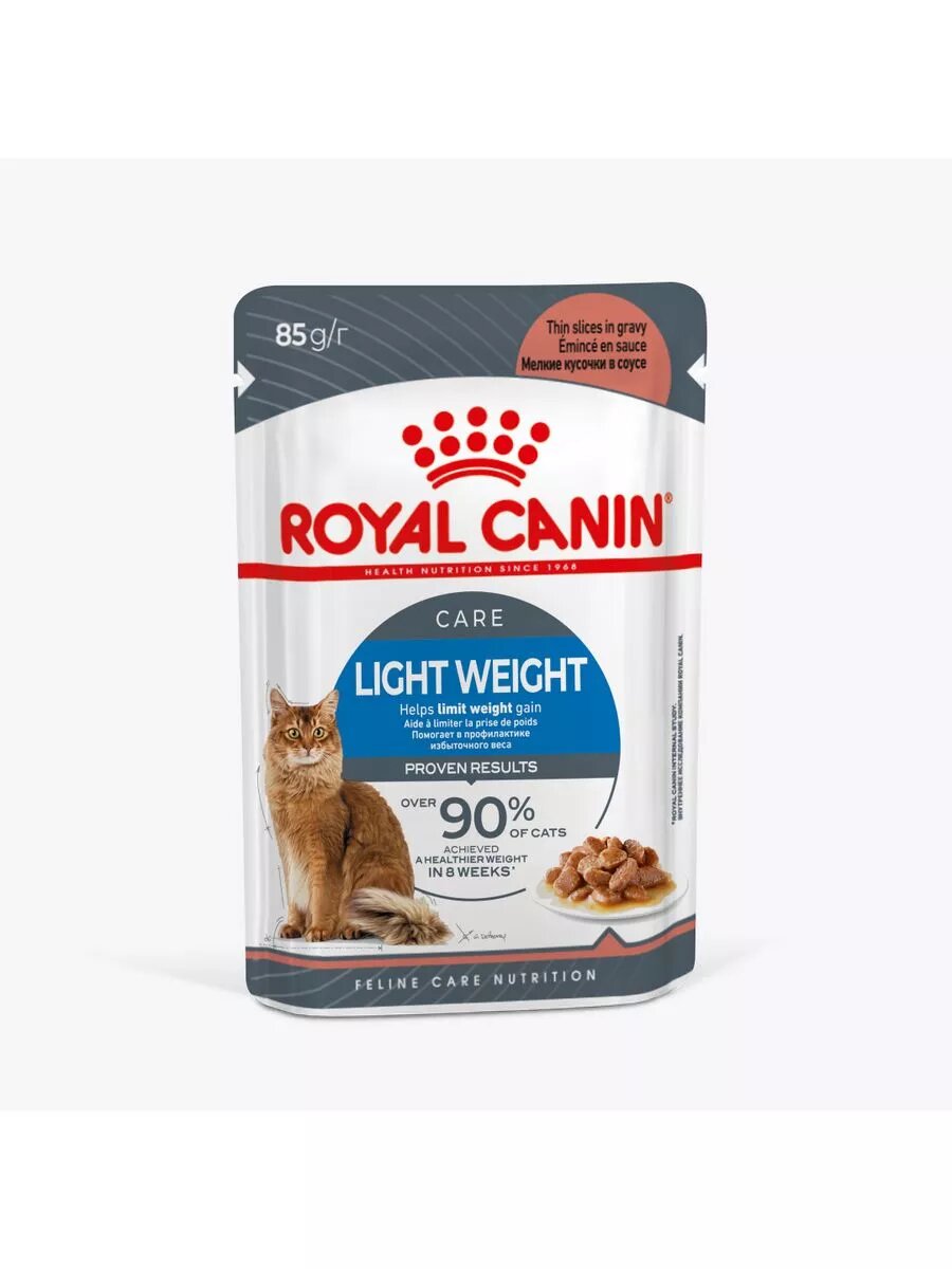 Корм ROYAL CANIN®Light Weight Care мелкие кусочки в соусе позволяет снизить спонтанное потребление калорий кошкой. Более 90%* животных достигли более здорового веса через 8 недель применения продукта. Продукт обогащен необходимыми питательными веществами, помогающими поддерживать обмен жиров.