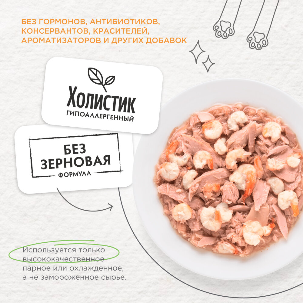 Максимум мяса и ничего лишнего! Гипоаллергенная беззерновая формула для улучшения здоровья и жизненной силы питомца. Полностью натуральное питание для кошек из отборного рыбного филе и мяса креветок класса Human Grade, приготовленное в собственном соку. Используется только отборное парное и охлажденное, а не замороженное сырье. Деликатный способ приготовления сохраняет все полезные свойства и питательные вещества ингредиентов, необходимые для здоровья кошек. Обладает высокими вкусовыми качествами, восхитительным ароматом и удовлетворит даже самого привередливого питомца. Натуральные и полезные ингредиенты обеспечивают отличное физическое состояние и долгую здоровую жизнь Вашего питомца. - увеличенный % добавок (креветки); - 100% натуральные и свежие ингредиенты; - 75% мяса в составе (45% филе тунца, 30% креветки); - 0% зерновых (Grain Free); - ингредиенты класса Human Grade пригодные в пищу человеку; - используются только филейные мясные и рыбные части - деликатный способ приготовления (cохранены все питательные вещества); - без гормонов, антибиотиков, консервантов, красителей, ароматизаторов и других добавок.