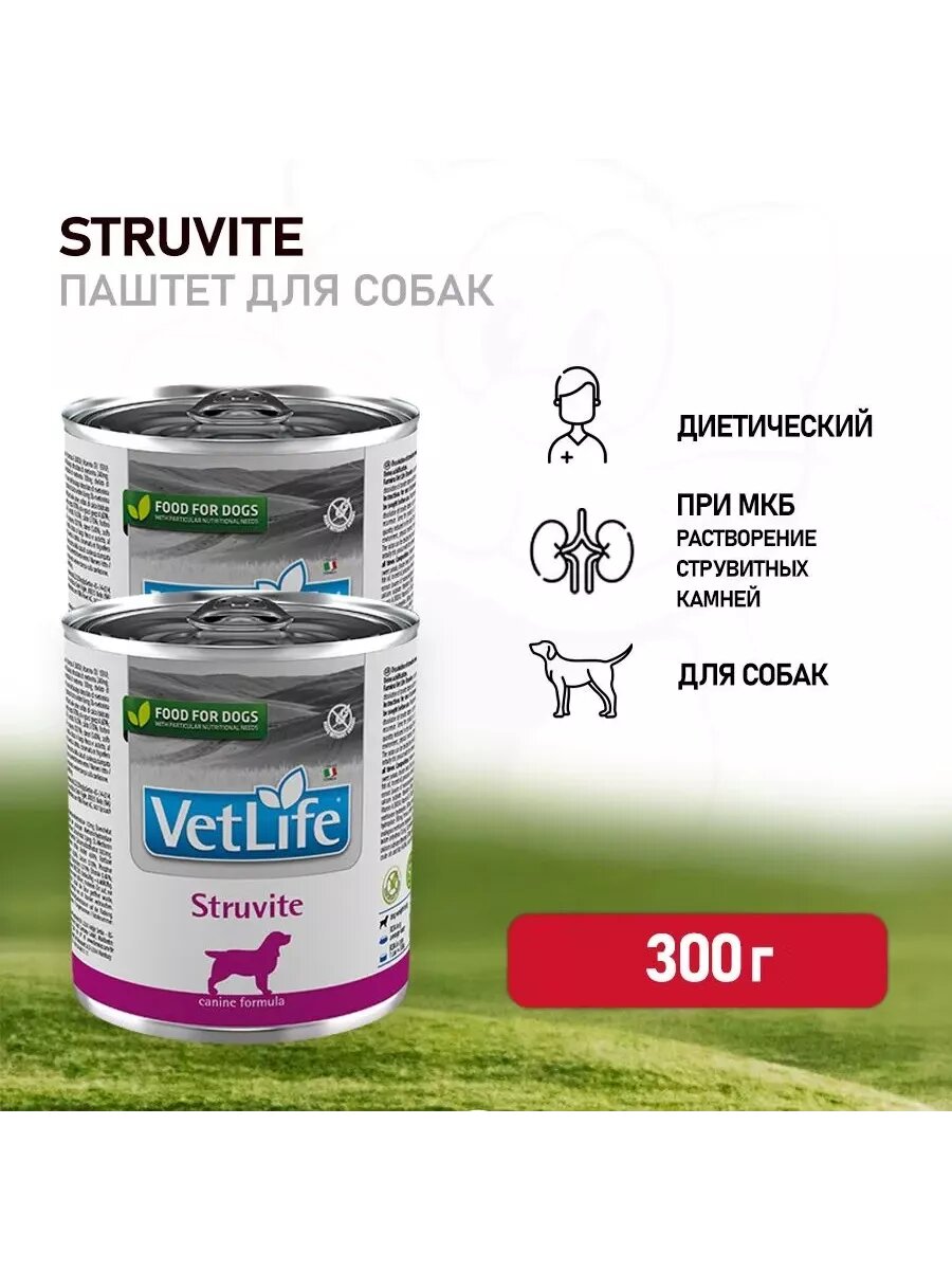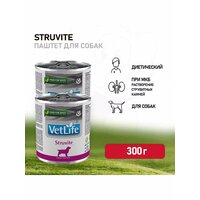 Консервы Farmina Vet Life Struvite – полнорационный диетический влажный корм для собак для лечения и профилактики рецидивов струвитного уролитиаза. Действие данной диеты направлено на: - растворение и подавление образования струвитных уролитов; - подкисление мочи. Состав: Мясо курицы, гидролизат белка рыбы, сырой яичный желток, сладкий картофель, куриная печень, рыба (сардина и тунец), киноа, животный жир (куриный), рыбий жир, льняное масло, хлорид калия, хлорид натрия, фруктоолигосахариды, дрожжевой экстракт (источник маннанолигосахаридов), сухие пивные дрожжи. Подкислитель мочи: дигидрат сульфата кальция (3 г/кг). Пищевые добавки на кг: Витамин А – 3800 МЕ, Витамин D3 - 150 МЕ, Витамин Е - 150 мг, Хелат цинка аналогичный метионин гидроксилазе - 240 мг, Хелат марганца аналогичный метионин гидроксилазе - 100 мг, Хелат железа гидрата глицина – 50 мг, Хелат меди аналогичный метионин гидроксилазе – 11 мг, Обогащенные селеном инактивированные дрожжи – 17 мг, Йодат кальция безводный - 0,6 мг, DL-метионин - 1750 мг, Таурин - 1000 мг. Подкислитель мочи: дигидрат сульфата кальция - 3000 мг. Питательные вещества: сырой белок - 9,70%, сырые жиры и масла - 4,60%, сырая клетчатка - 0,30%, сырая зола - 1,90%, влага - 76,00%, кальций - 0,10%, фосфор - 0,09%, натрий - 0,20%, калий - 0,22%, магний - 0,019%, хлорид - 0,40%, сера - 0,10%, таурин - 0,12%. Энергетическая ценность: 993 ккал/кг - 4,15 Мдж/кг.