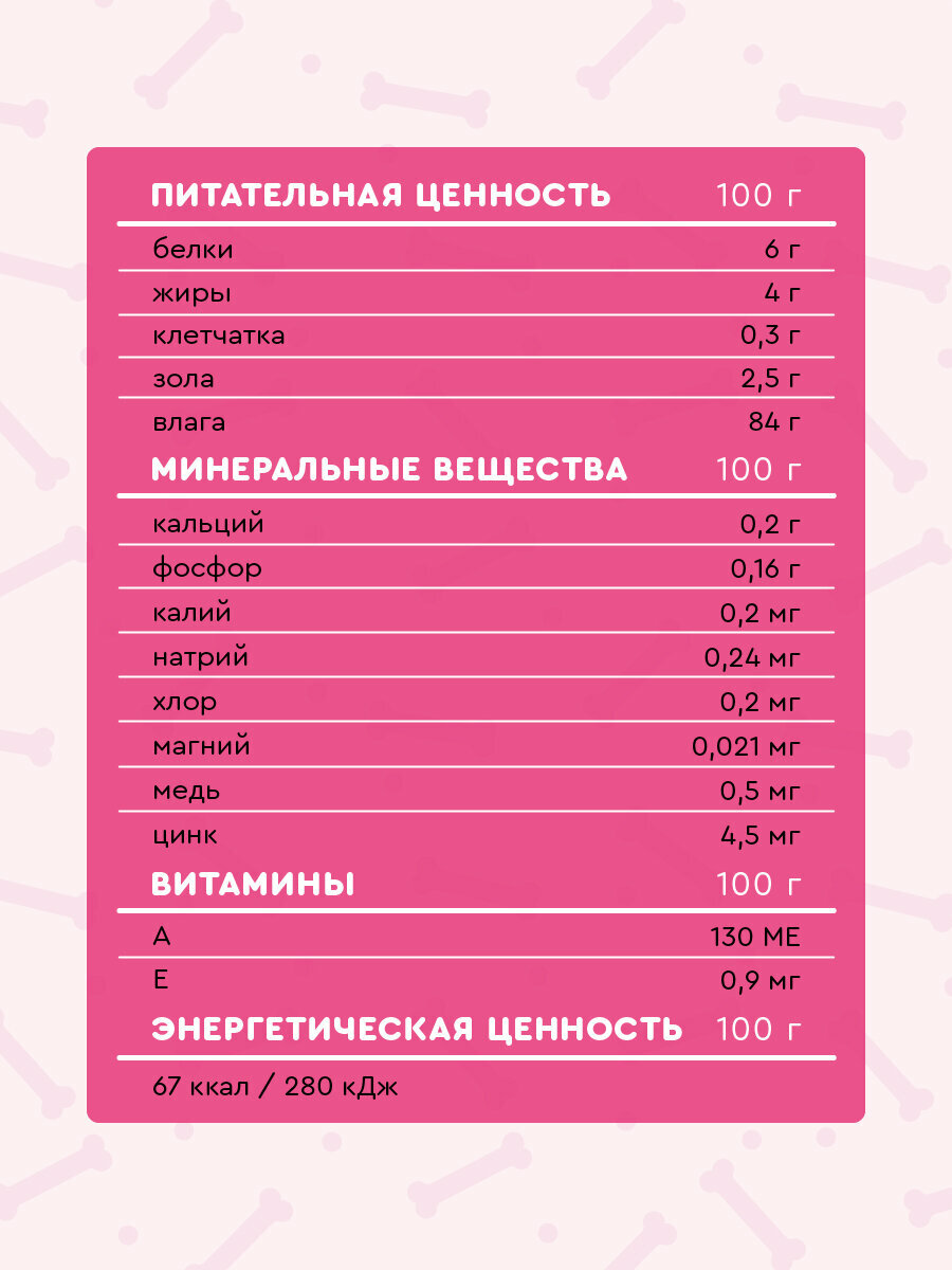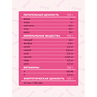 | Пищевая ценность | белки - 6 г, жиры - 4 г, зола - 2,5 г, клетчатка - 0,3 г, влага - 84 г |