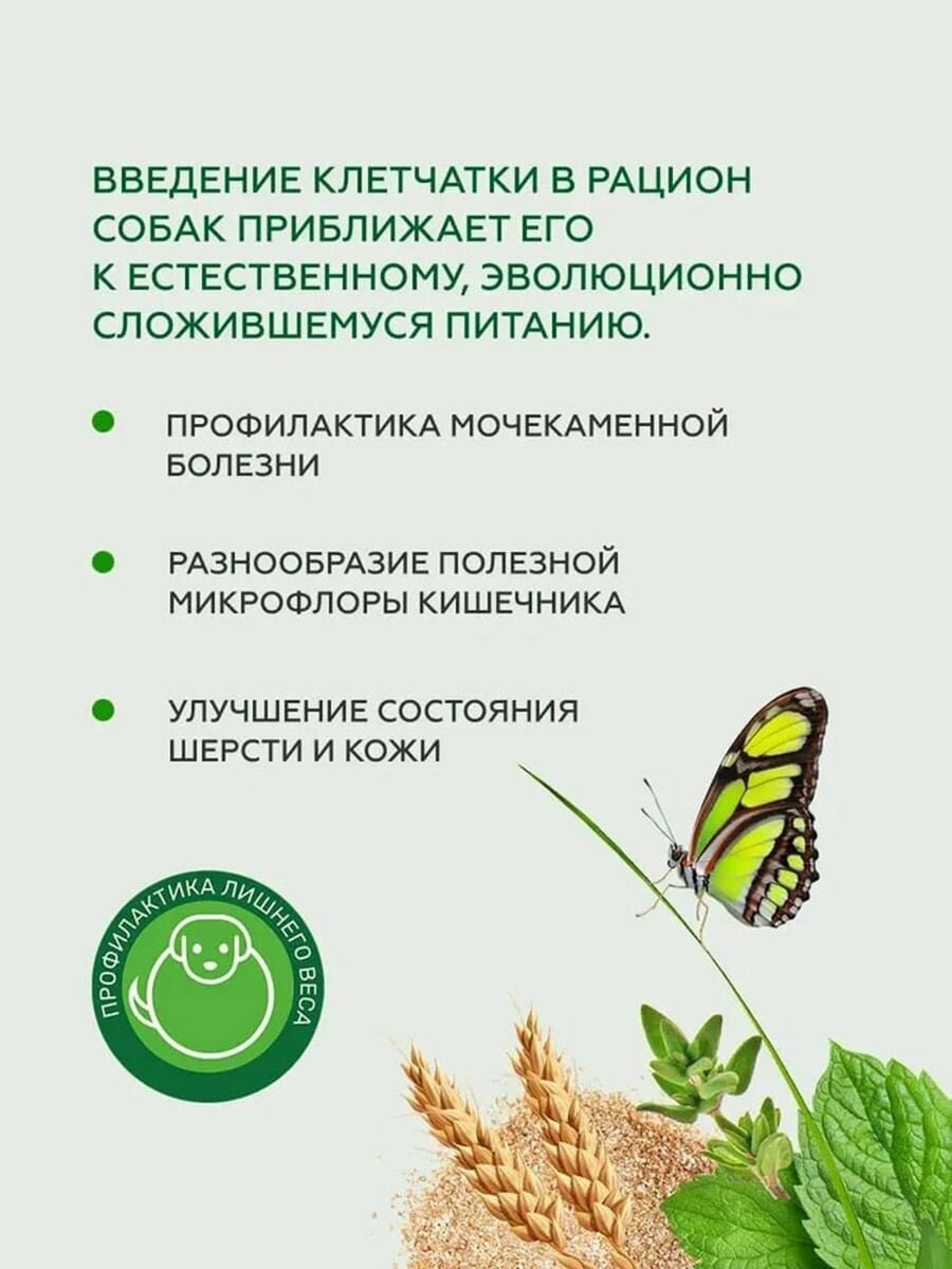 Физиология собак во многом похожи на физиологию человека. Поэтому здоровье собак, как и людей страдает от лишнего веса и не сбалансированного питания. Избыточный вес серьезно отражается на здоровье, настроение, активности и внешнем виде наших питомцев. Как для человека, так и для собак эффективным природным средством для правильной работы желудочно-кишечного тракта и поддержания оптимального веса является компонент растительной пищи - клетчатка. Несмотря на то, что собака является плотоядным хищником для поддержания хорошей формы и полноценного обмена веществ ей ежедневно необходимо съедать определенное (порядка 20%) количество растительной пищи и соответственно клетчатки.