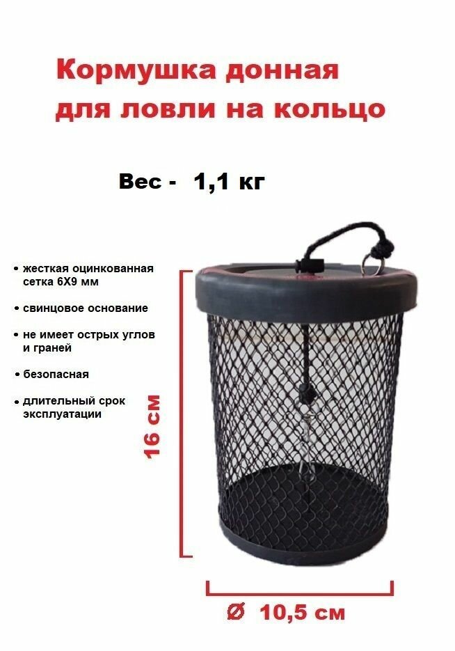 Кормушка рыболовная донная для ловли леща с лодки на течении. Изготовлена из жесткой оцинкованной сетки, ячейка в свету 6Х9 мм, окрашенная, со свинцовым основанием, ручная работа. Идеальна для перловки и пшена. Объем 1,4 л. Верх кормушки изготовлен так, что не имеет острых углов и граней и не причинит пользователю травм: царапин, порезов и т. д. Дно кормушки не имеет выступающих частей, поэтому не будет цепляться за камни, коряги и пр. на дне реки. Кормушка имеет жесткую и прочную конструкцию и рассчитана на длительный срок эксплуатации. Рекомендация: для опускания кормушки на дно использовать прочный шнур: капроновый, полипропиленовый, кевларовый, но не леску, какой бы толщины она ни была. По мнению пользователей, данная кормушка является лучшей для ловли на кольцо. Просим Вас оставлять отзывы о наших кормушках. Нам, как производителю, очень важна обратная связь для постоянного усовершенствования и улучшения качества продукции.