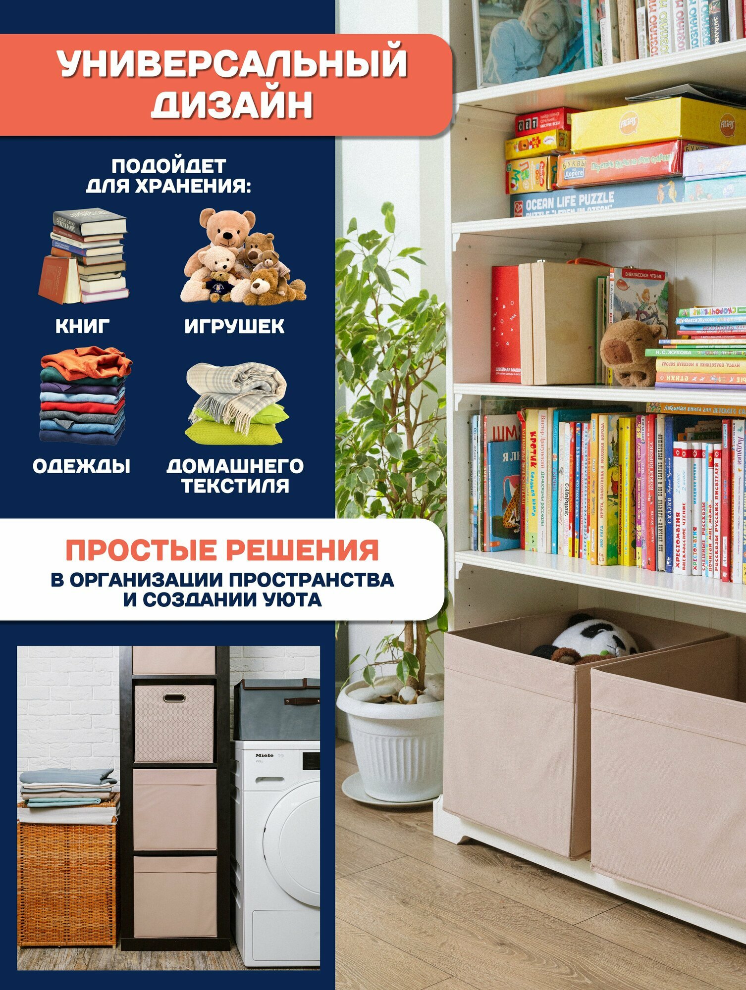 Коробки для хранения вещей выполнены из качественного нетканого полотна и плотного картона, которая обеспечивает долговечность и надежность изделия. Их стильный и лаконичный дизайн подойдет к любому интерьеру, будь то спальня, гостиная или гардеробная. Благодаря прочным ручкам, вы без труда сможете перемещать коробки и устанавливать их на полках, в шкафах или под кроватью.