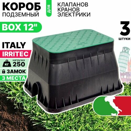 Прямоугольные клапанные боксы IRRITEC коробы для клапанов, изготовлены из пластика, имеют зеленую крышку с логотипом компании. Корпус короба имеет ребра жесткости и не подвержен деформации при установке в грунте. Крышка короба так же укреплена ребрами и выдерживает вес человека и небольшого автомобиля. Коробы предназначены для установки в грунт и обеспечения ревизионного доступа к клапанам, кранам и другим узлам подземных коммуникаций. При необходимости в коробе можно вырезать дополнительные технологические прорези, это легко сделать при помощи "болгарки" или ручной ножовки.