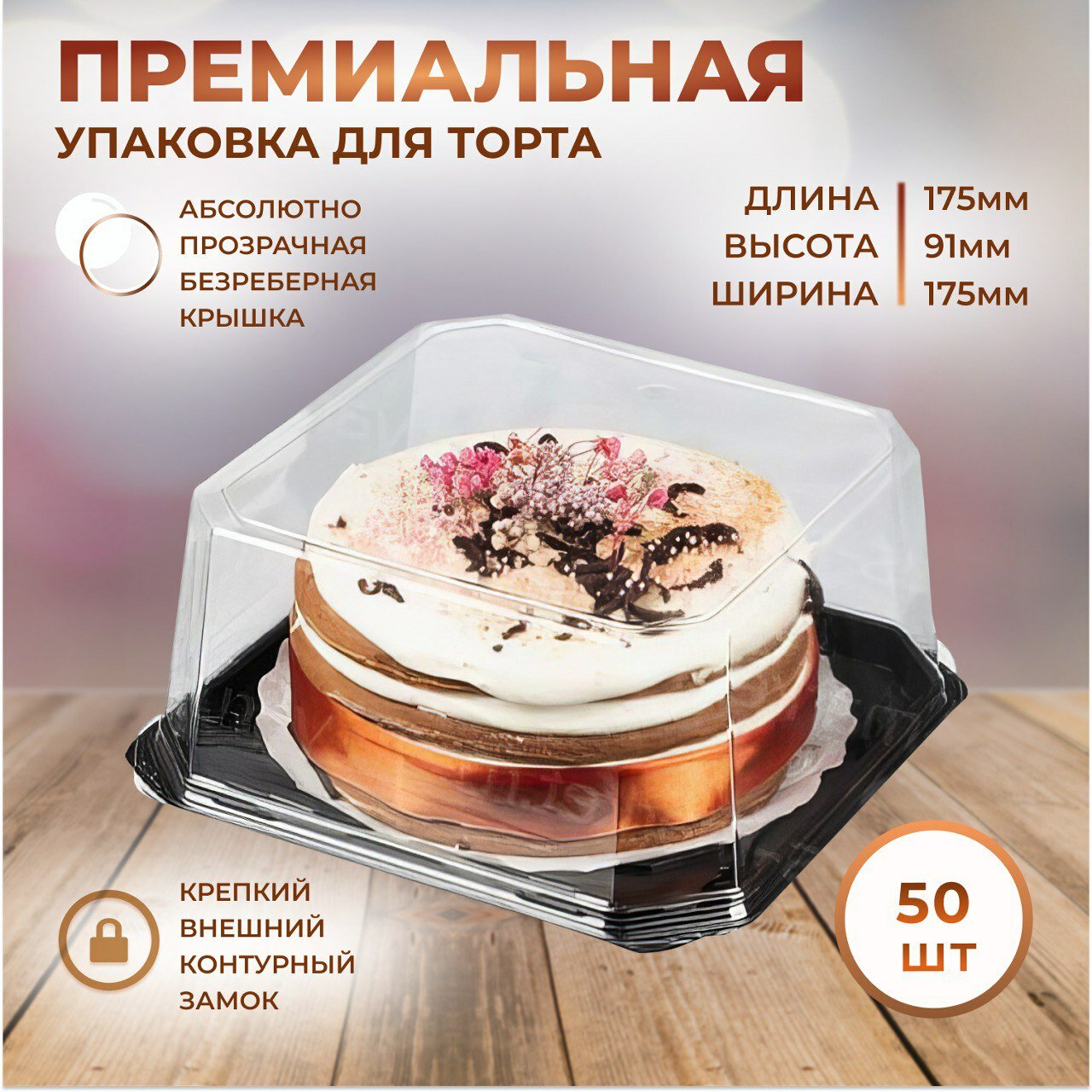 Наша подарочная коробка для торта - специально разработана для тех, кто ценит превосходное качество упаковки и ищет стильное решение для своих восхитительных десертов. Коробка для торта квадратная и прозрачная, чтобы позволить Вашим кулинарным шедеврам сиять и выглядеть аппетитно. Состоит из 2-х частей: пластиковая прозрачная круглая крышка и дно в виде подложки коричневого цвета.