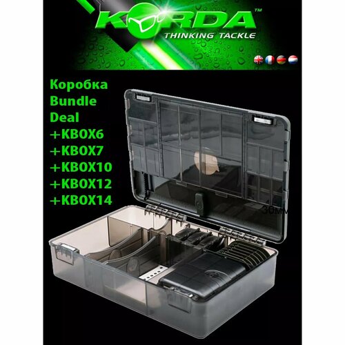 Korda Tackle Box Bundle Deal в комплекте KBOX6+KBOX7+KBOX10+KBOX12+KBOX14 – полная универсальная система хранения, призванная пополнить арсенал современного карпятника. Изготовлена из прочного прозрачного пластика. С этой новой коллекцией коробок у вас все теперь будет под рукой! В набор входит мультифункциональная коробка Tackle Box, а также такие незаменимые органайзеры, как большая коробка для хранения ледкоров, две миникоробки с 9 и 16 отделениями и три коробочки для мелочей. В комплект входят:- Коробка TackleBox - Коробка Large Leader Safe- Коробка Mini Box на 9 отделений- Коробка Mini Box на 16 отделений- Три коробочки Accessory Boxes