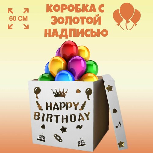 Большая коробка 60х60 см с крышкой. В наборе наклейка с надписью "Happy Birthday" золотистого цвета. Собрать коробку сможет любой для этого понадобится всего одна лента скотча. Время сборки 1 минута! Коробку легко перевозить в разобранном состоянии, помещается в любой автомобиль. Можно использовать как подарочную коробку!