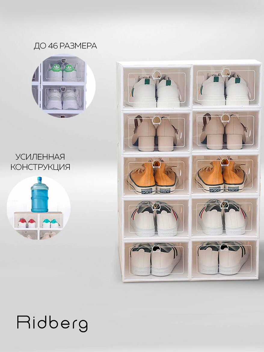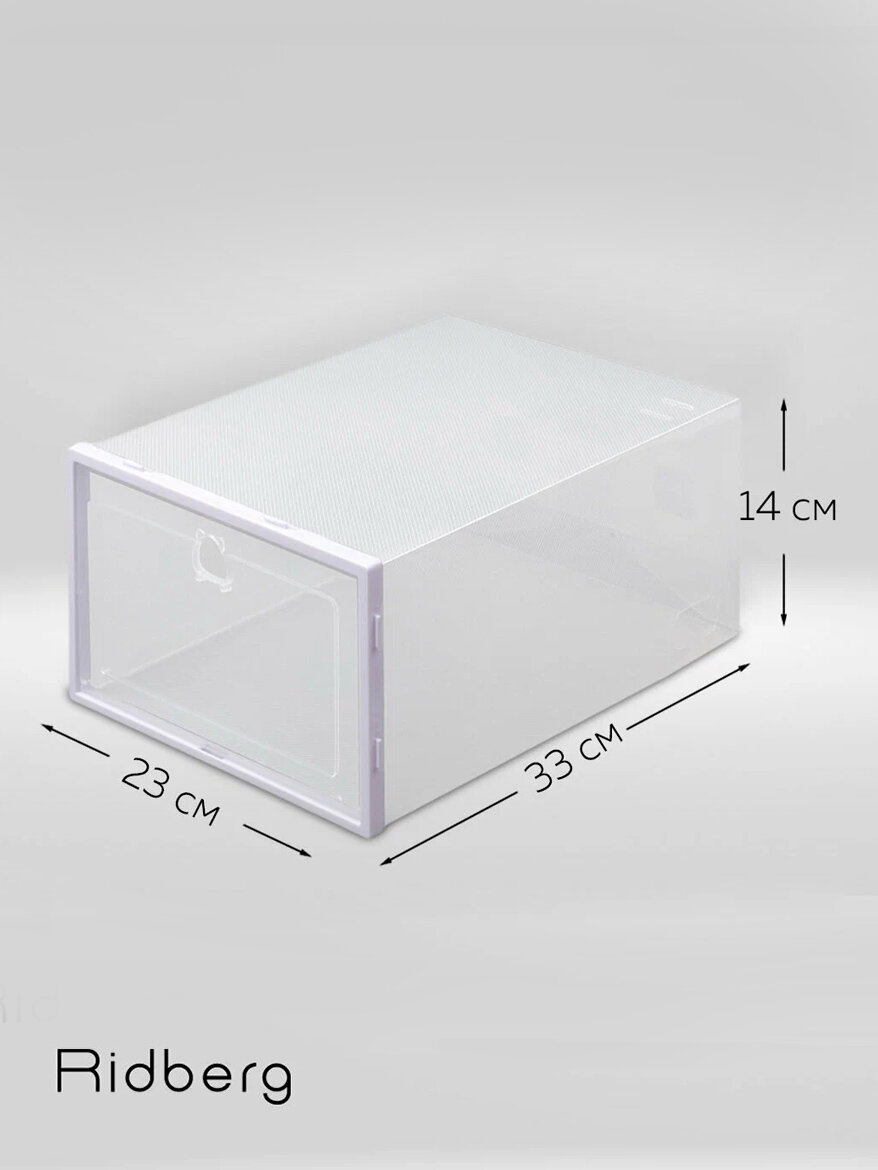 Коробки для хранения обуви Ridberg это идеальное решение для организации и защиты вашей обуви, сочетающее в себе простоту использования и надёжность. Эти плотные коробки обеспечивают безопасность хранения, защищая обувь от пыли, влаги и даже домашних животных, что помогает сохранить её в идеальном состоянии. Способствуют экономии свободного места, позволяя компактно хранить обувь и поддерживать порядок в гардеробе