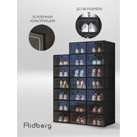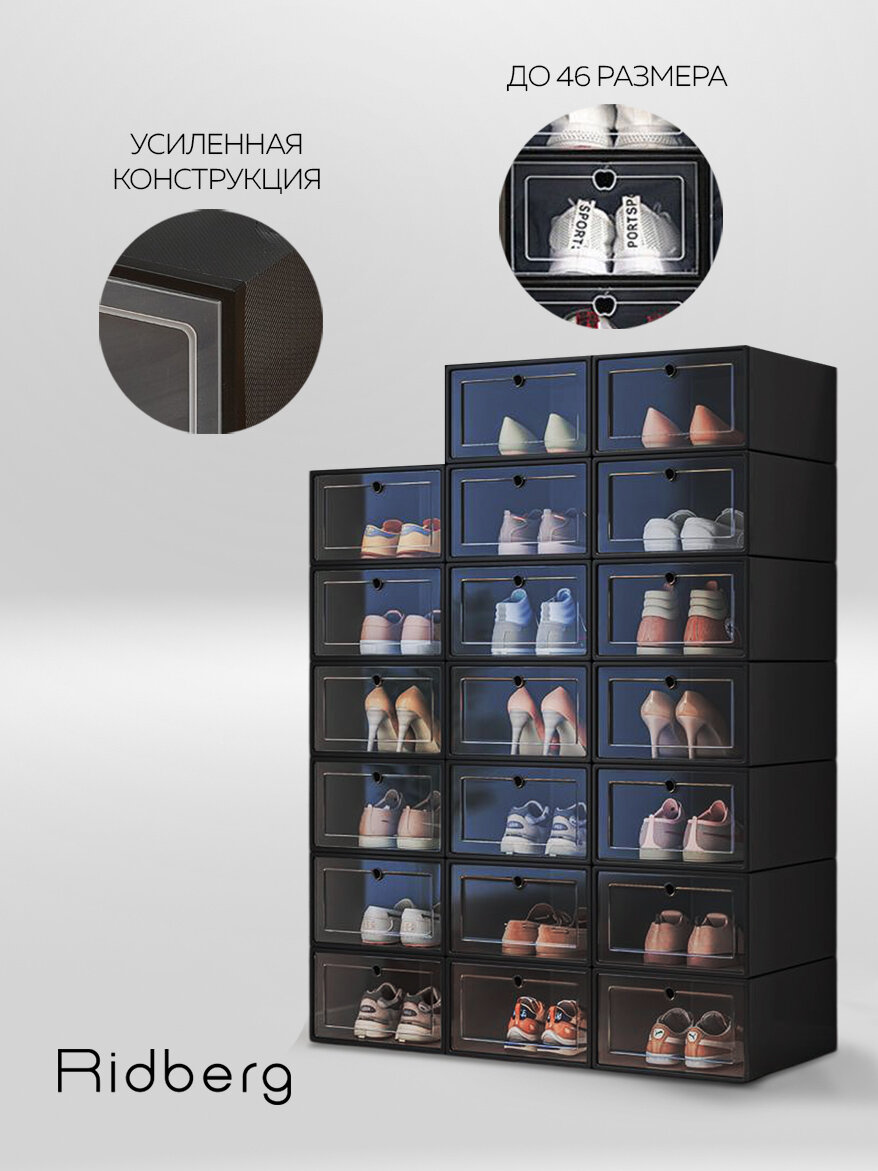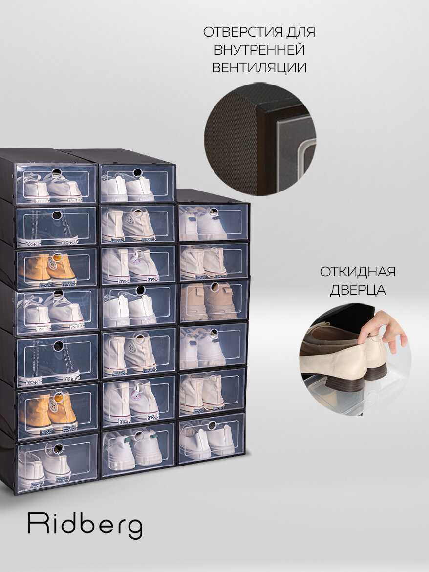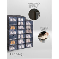 Коробки Ridberg эффективно экономят свободное место, позволяя компактно разместить обувь и поддерживать порядок в шкафу или гардеробной. Продуманный дизайн обеспечивает лёгкий доступ к содержимому, а стыкуемая конструкция коробок сохраняет их устойчивое положение, предотвращая случайное опрокидывание. Простота ухода за этими коробками добавляет комфорта в их использовании, делая хранение обуви не только удобным, но и эстетически приятным. Коробки Ridberg помогут вам организовать пространство и добавят стиль в вашу систему хранения.