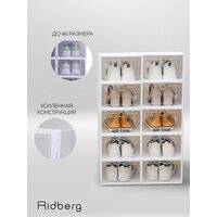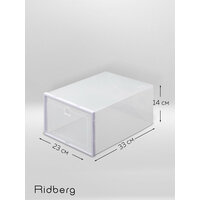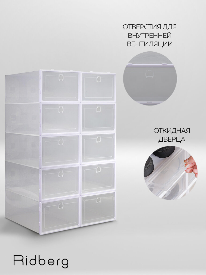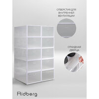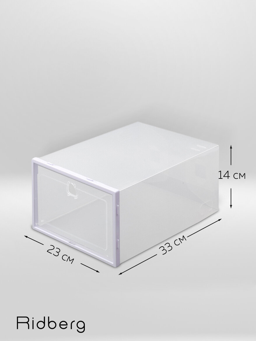 Коробки для хранения обуви Ridberg предназначены для компактного хранения вещей как в закрытом шкафу, так и на открытых полках. Систематизируйте пространство, чтобы каждая вещь лежала на своем месте и была под рукой. Коробки имеют складную конструкцию и малый вес и подходят для любых вещей и предметов. Набор коробок для хранения Ridberg выполнен из плотного прозрачного пластика, поэтому вы с легкостью найдете нужную пару обуви.
