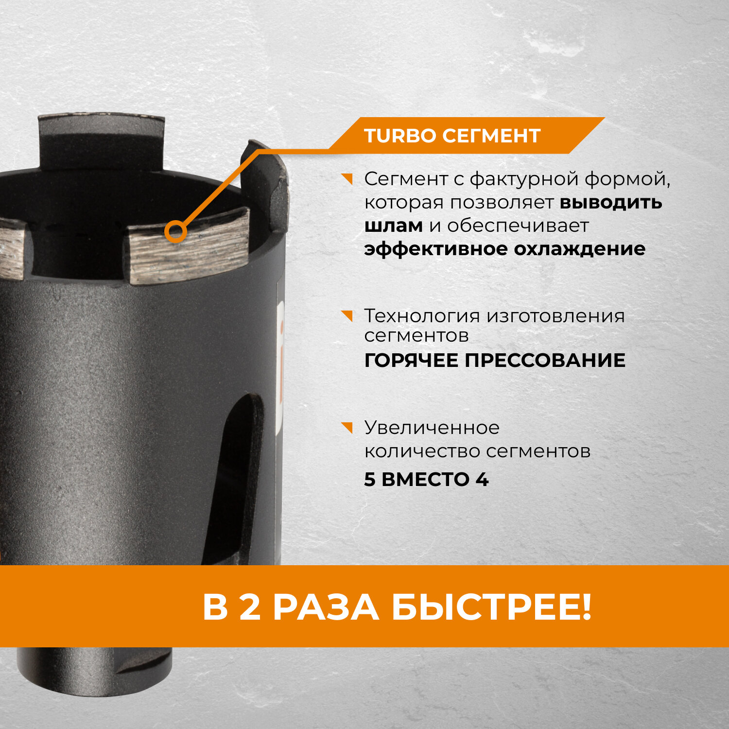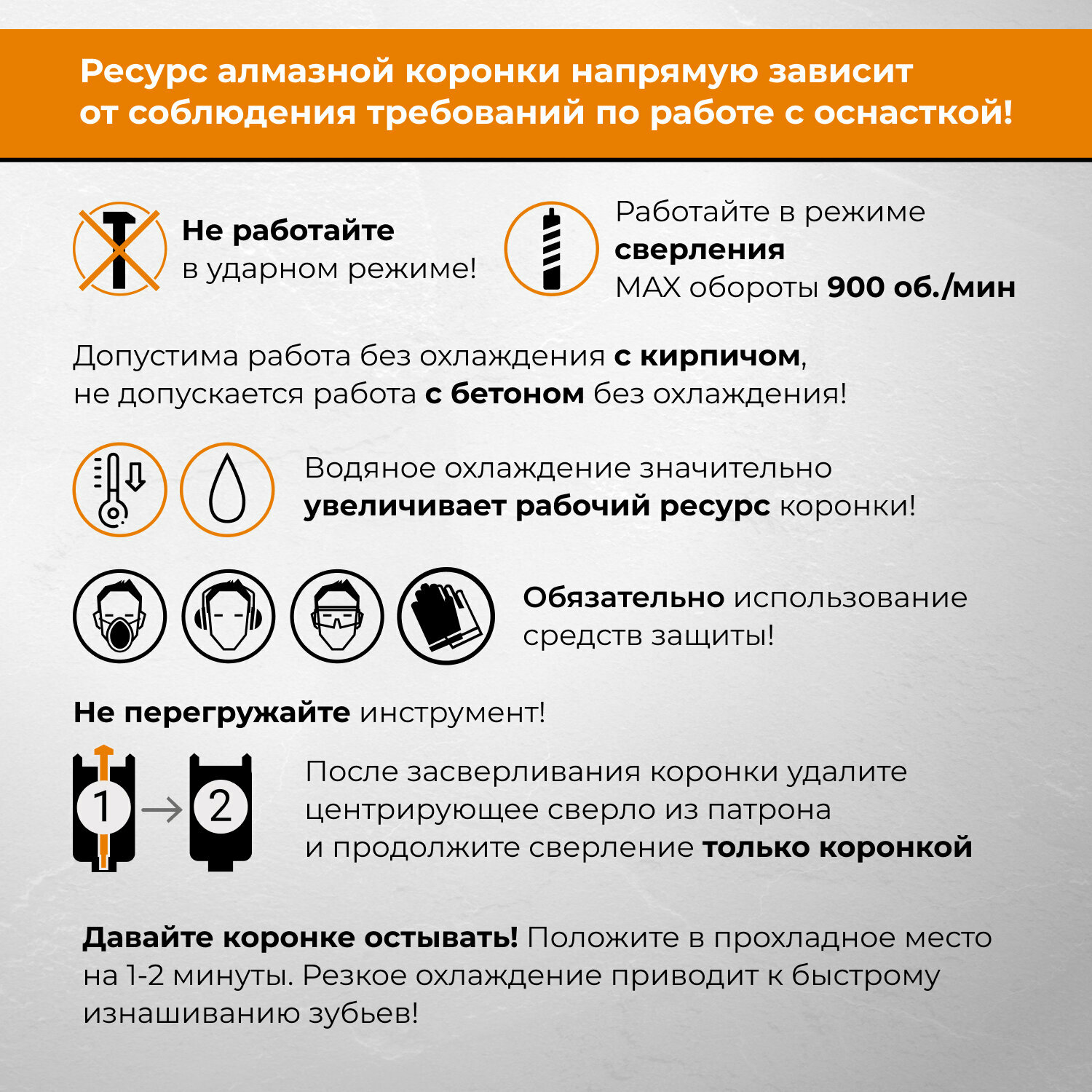 Данная коронка предназначена для работы с помощью перфоратора в безударном режиме в армированном бетоне (максимальный диаметр арматуры 22 мм), бетоне, кирпиче, силикатном кирпиче и камне. Центрирующее сверло помогает обеспечить точное позиционирование и сверлить без отклонений. Увеличенное количество сегментов (5шт.) способствует повышению скорости сверления и делает коронку более устойчивой к механическому разрушению, т. к. снижает возможность удара о армирующие элементы. В конструкции предусмотрены заостренные зубцы для быстрого вхождения в материал и точного расположения отверстий. При работе с водным охлаждением удается избавиться от шлама и получить ровный рез. Также в коронке предусмотрены компенсационные отверстия, которые позволяют погасить вибрацию, значительно снизить уровень шума при работе и способствуют быстрому охлаждению инструмента.