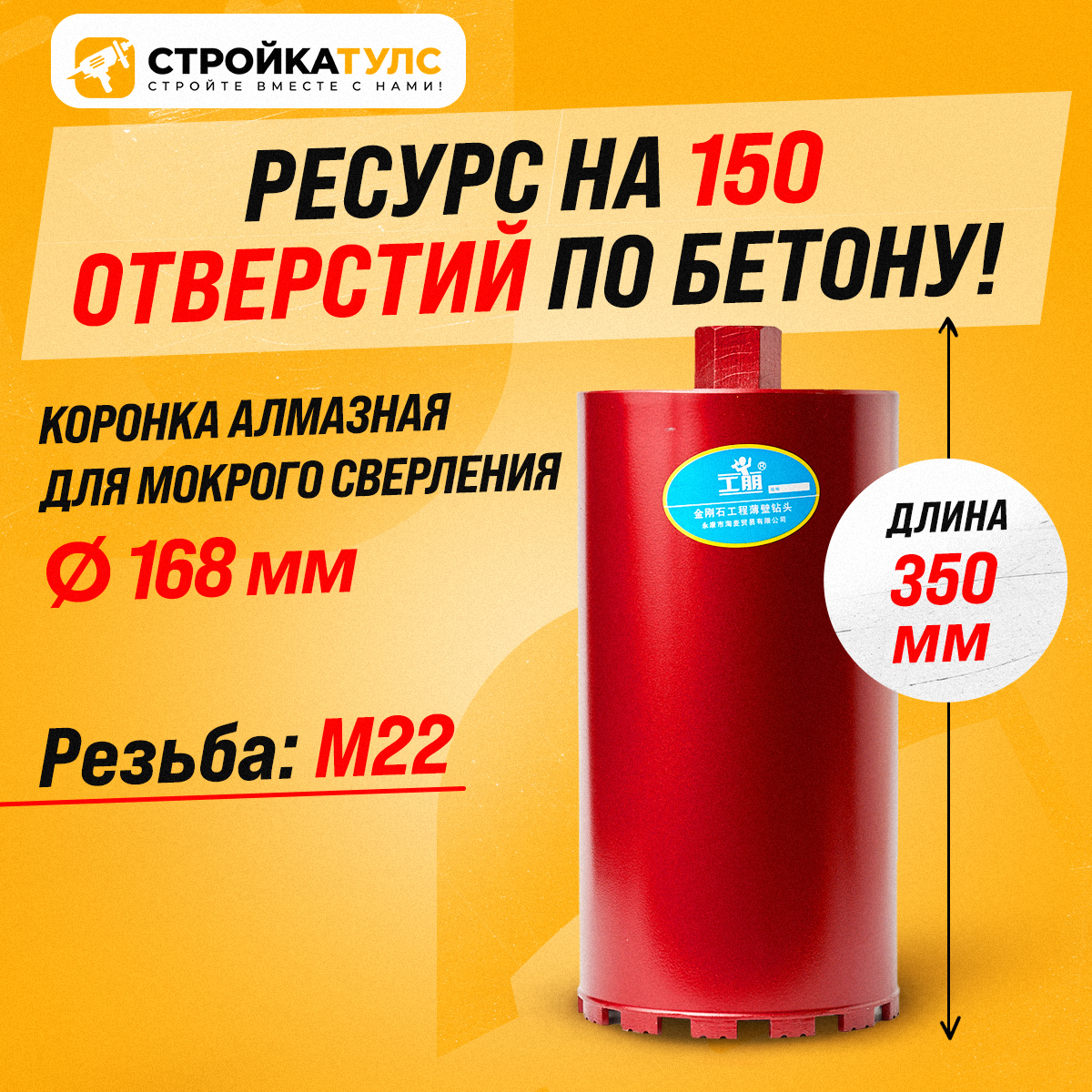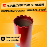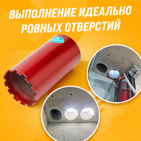 Высококачественная алмазная коронка для мокрого сверления. Вода эффективно охлаждает коронку и способствует выведению отработанного материала из области реза, увеличивая производительность и срок службы коронки. Длина алмазных коронок для мокрого бурения составляет 350 мм. Работают с такими материалами, как бетон, железобетон, кирпич, пеноблок с использованием воды. У коронок мокрорезов выше ресурс, чем у сухорезов. Хвостовик: М22х2,5 мм - не нужен адаптер при работе с китайскими дрелями. Протестированы профессионалами, легко справляются даже с сильно армированным бетоном. Подходит для работ электриков, сантехников, кондиционерщиков, вентиляционщиков и т. д, а также для сквозных отверстий