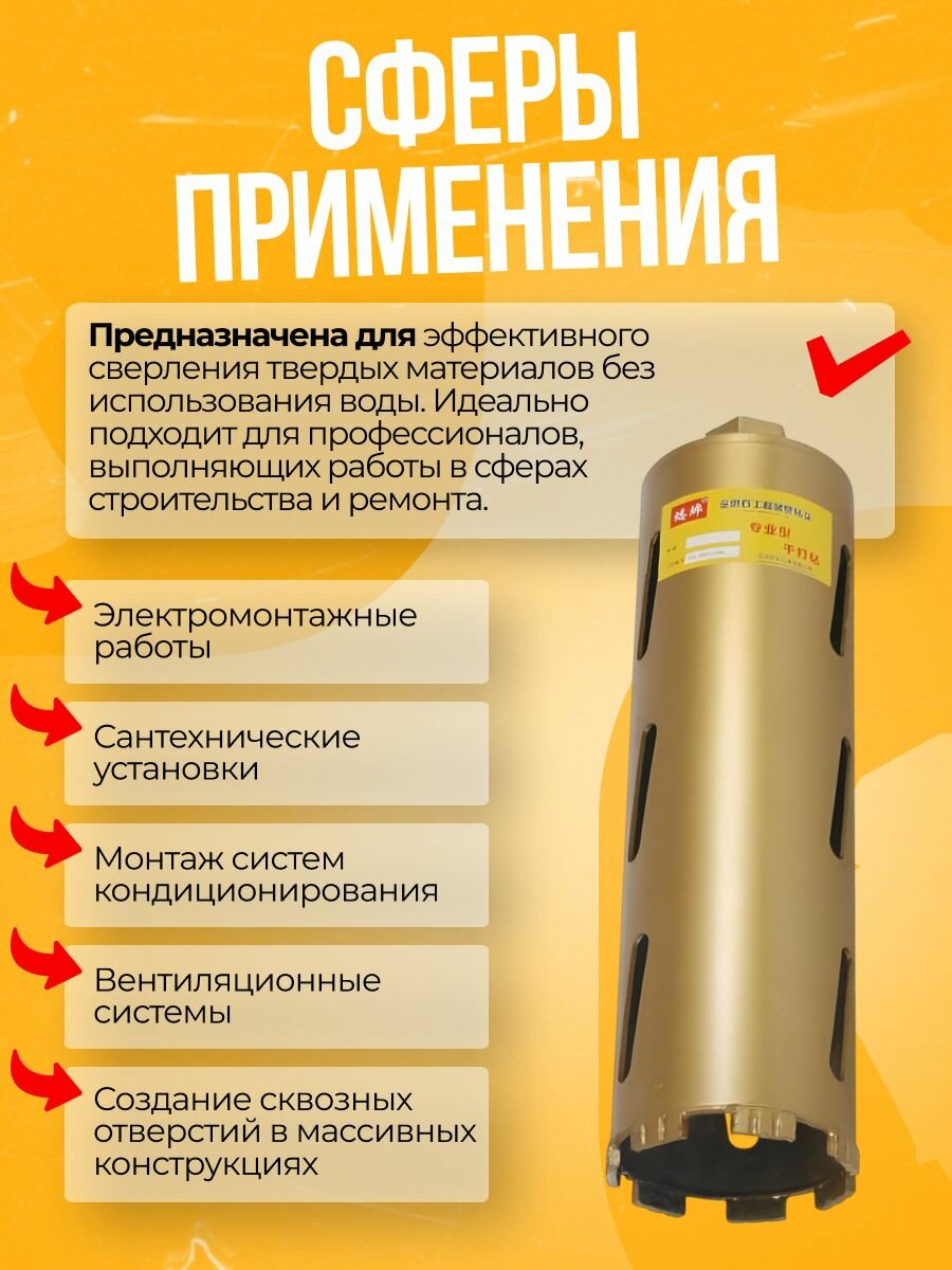Алмазные коронки для сухого сверления используется с алмазными дрелями при сухом сверлении. Напаянные лазерным способом алмазные сегменты обеспечивают повышенную скорость сверления и большой ресурс работы коронки.