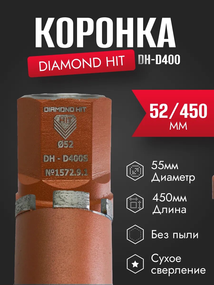 Назначение: Бетон, железобетон с любой степенью армированияОборудование: Двигатели и дрели алмазного сверления с функцией микроудара, мощностью от 1,5 - 3,2 кВтОсобенности: Предназначены для сверления в сухую (без подачи СОЖ) с применением системы микроудараГК «Адель» изготавливает алмазные коронки длиной до 5 000 мм. Алмазные коронки длиной свыше L - 1 500 мм заказываются и рассчитываются индивидуально. Алмазные коронки Diamond Hit изготавливаются методом лазерной сварки. Передовая технология работы по железобетону и бетону разного уровня армирования DH. Алмазная коронка Diamond Hit D400 ∅52 мм для сверления без подачи СОЖ, благодаря чему исключено попадание воды на электропроводку и сохраняет уже сделанный, чистовой ремонт. Идеальна для проведения работ в помещениях с чистовой отделкой. Вся серия алмазных коронок Diamond Hit рассчитаны на эксплуатацию в режиме высокочастотного микроудара, амплитудой в диапазоне 0,5-0,8 мм и энергией удара 0,1-0,2 Дж. При этом частота должна составлять 15000-30000 ударов в минуту.