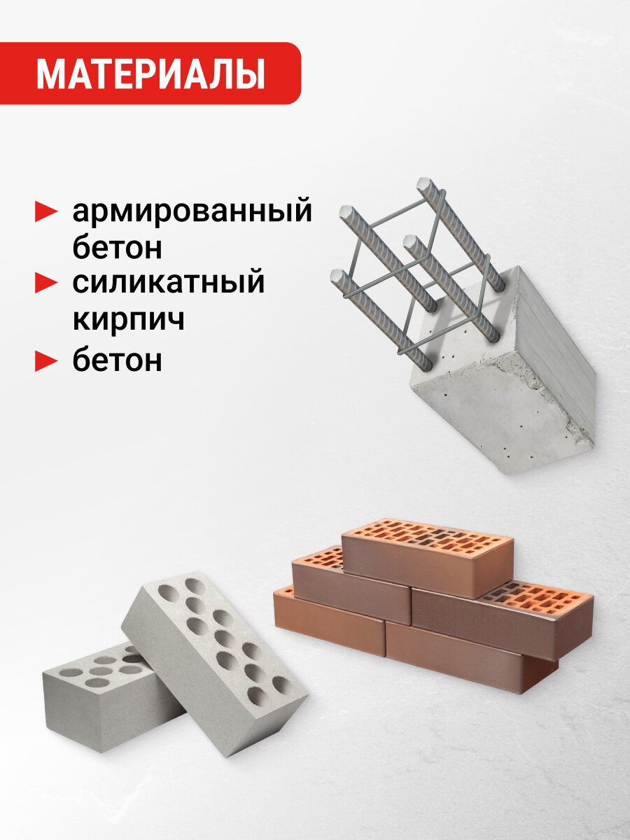 - Назначение: для сверления отверстий в армированном бетоне с максимальным диаметром арматуры 22 мм, бетоне, кирпиче, силикатном кирпиче, камне
