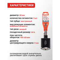 Данная коронка предназначена для работы с помощью перфоратора в безударном режиме в армированном бетоне (максимальный диаметр арматуры 22 мм), бетоне, кирпиче, силикатном кирпиче и камне. Центрирующее сверло помогает обеспечить точное позиционирование и сверлить без отклонений. Увеличенное количество сегментов (5шт.) способствует повышению скорости сверления и делает коронку более устойчивой к механическому разрушению, т. к. снижает возможность удара о армирующие элементы. В конструкции предусмотрены заостренные зубцы для быстрого вхождения в материал и точного расположения отверстий. При работе с водным охлаждением удается избавиться от шлама и получить ровный рез. Верхние отверстия в коронке предназначены для отведения пыли из зоны реза что предотвращает заклинивание коронки, а также способствует охлаждению сегментов и коронки. Коронка предназначена для работы с насадкой пылеудаления (приобретается отдельно).