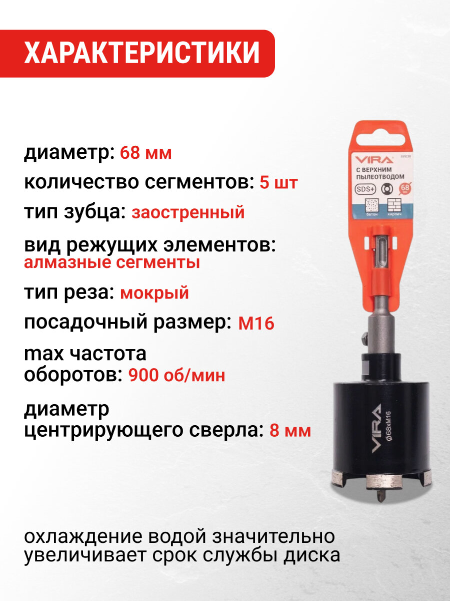 Коронка алмазная по бетону для подрозетников с верхним пылеотводом 68 мм VIRA