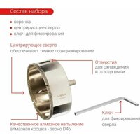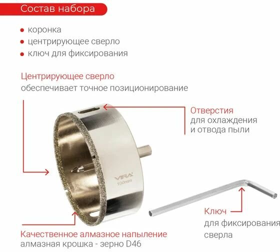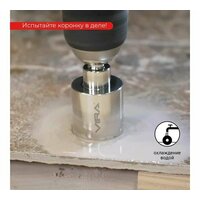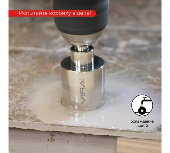 Коронка алмазная по керамике VIRA 100 мм трехгранный хвостовикДиаметр: 100 мм, Максимальная глубина сверления: 50 мм, Длина коронки: 70 мм, Размер хвостовика коронки: 9,5 мм, Тип хвостовика: цилиндрический с тремя гранями, Материал коронки: сталь CS45, Материал режущей части коронки: алмазная крошка, Размер зерна: D46, Тип сверления: мокрый, Комплектация: коронка, центрирующее сверло, ключ для фиксирования сверла. Данная алмазная коронка используется для сверления отверстий в керамограните, керамической плитке и камне. При работе важно не перегревать коронку - необходимо правильное использование водного охлаждения. Центрирующее сверло в комплекте исключает возможность смещения инструмента во время работы, а также обеспечивает лучшее позиционирование при сверлении в заранее подготовленном месте. Хвостовик трехгранной формы делает возможным использование изделия совместно с дрелями, шуруповертами, сверлильными станками оснащенными быстрозажимным патроном. Такая форма предотвращает проворачивание при сверлении. При работе с оснасткой требуется подача воды в зону реза. Жидкость способствует охлаждению инструмента и вымывает образующийся шлам. Отверстие в корпусе коронки также способствует отводу строительной пыли и охлаждению оснастки.