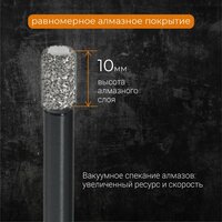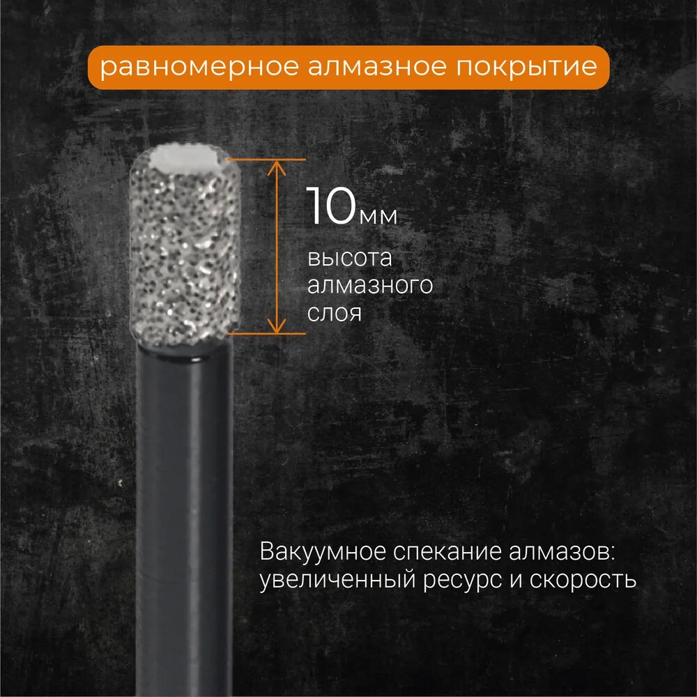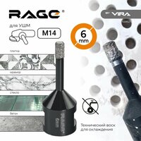 Универсальная алмазная коронка RAGE для УШМ: Подходит как для сухого, так и для мокрого реза, Для работ по керамограниту, напольной плитке высокой твердости, натуральному и искусственному камню, керамике, Охлаждащий воск, Хвостовик с резьбой М14 (для УШМ), Максимальная частота оборотов - 11 000 об./ мин, Высокотемпературное вакуумное спекание алмазов, Алмазное зерно D46, Высота алмазного слоя - 10 мм, Материал коронки СS45, Диаметр коронки - 6 мм, Максимальная глубина сверления - 33 мм, Высота коронки - 60 мм, Алмазная коронка для УШМ RAGE позволяет выполнять ровные отверстия в твердых, но хрупких материалах без подачи воды. Благодаря технологии высокотемпературного вакуумного спекания алмазов удалось значительно повысить ресурс алмазной коронки и увеличить скорость сверления. Обратите внимание: коронка НЕ подходит для работ по бетону и кирпичу. Обратите внимание: подача воды в зону реза может значительно увеличить ресурс коронки.