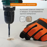 Коронка алмазная по керамограниту с шестигранным хвостовиком RAGE by VIRA позволяет выполнять ровные отверстия в твердых, но одновременно хрупких материалах. Центрирующее сверло в комплекте исключает возможность смещения инструмента во время работы, а также обеспечивает лучшее позиционирование. Шестигранный хвостовик обеспечивает надежную фиксацию в патроне, максимально удобен в использовании с патронами HEX. Возможно сверление под углом
