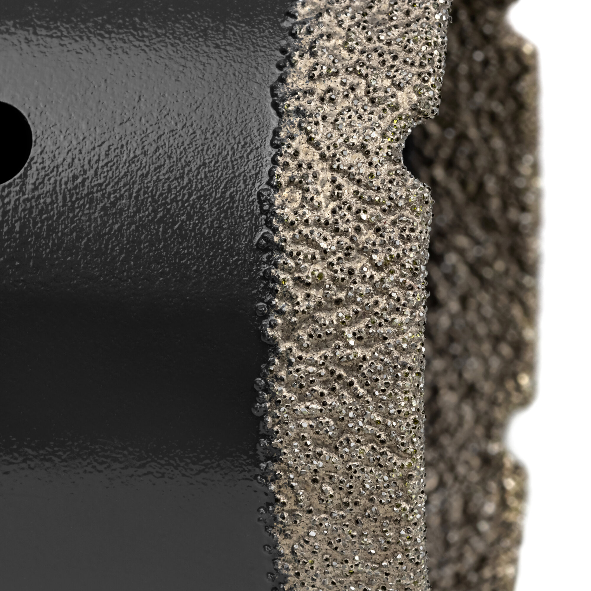 Особенностью данной коронки является технология вакуумно-жидкостного спекания (ВЖС), которая обеспечивает высокую концентрацию алмазных зерен и их плотное прижатие друг к другу. Это увеличивает скорость выполнения операций и повышает ресурс коронки.