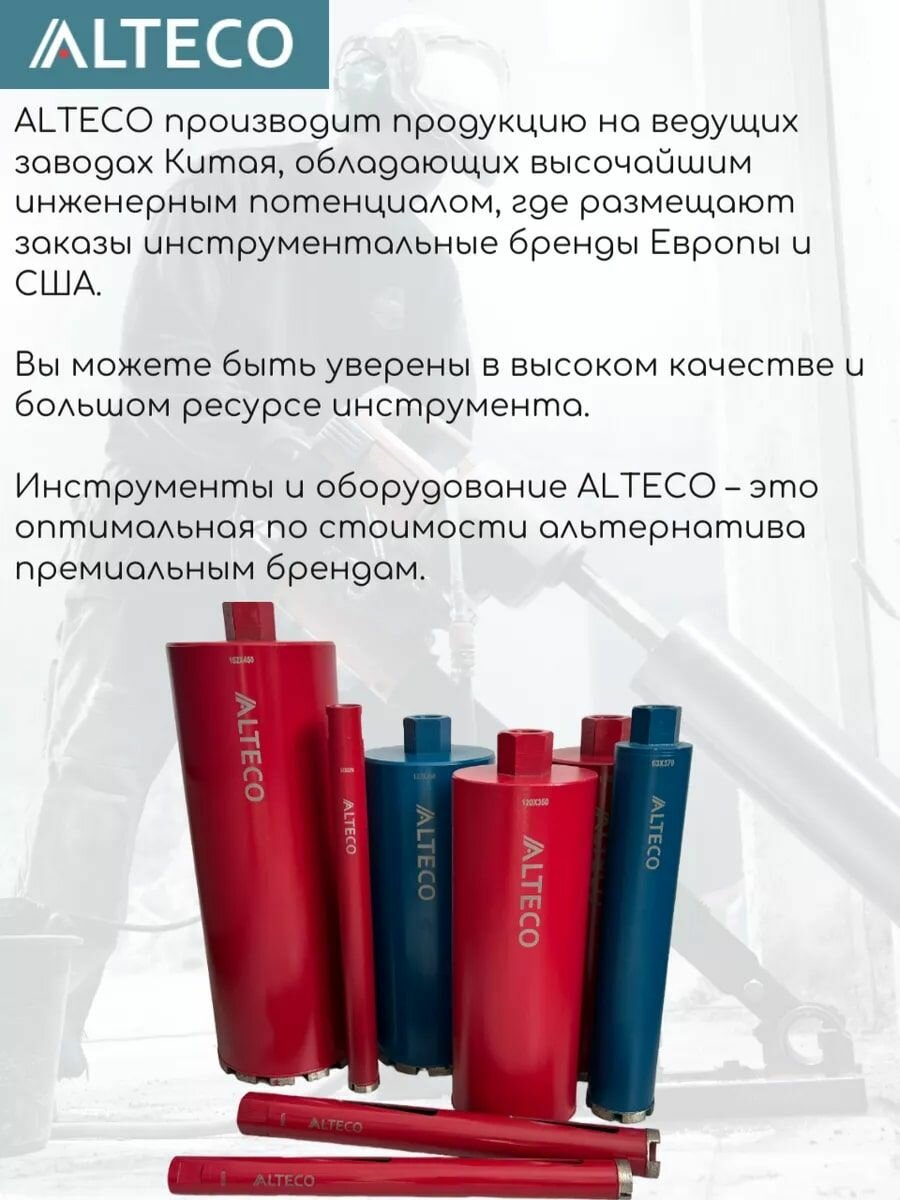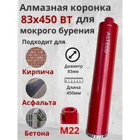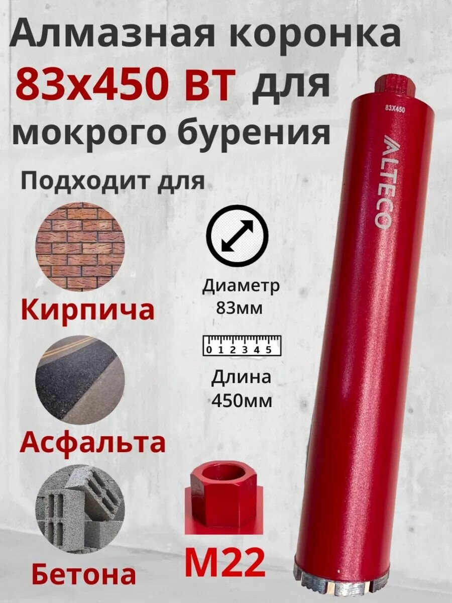 Коронка алмазная ВТ (83х450 мм) ALTECO 13242 является сменным элементом для установок алмазного бурения. Предназначена для бурения ровных отверстий во всех видах бетона, кирпича и асфальта.