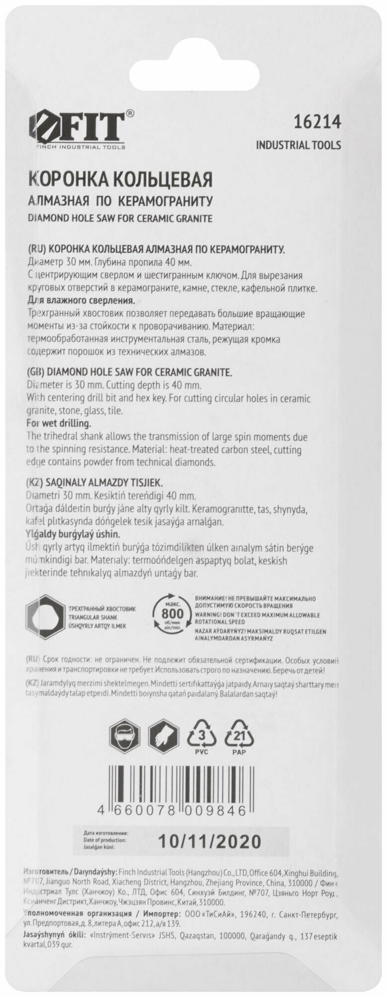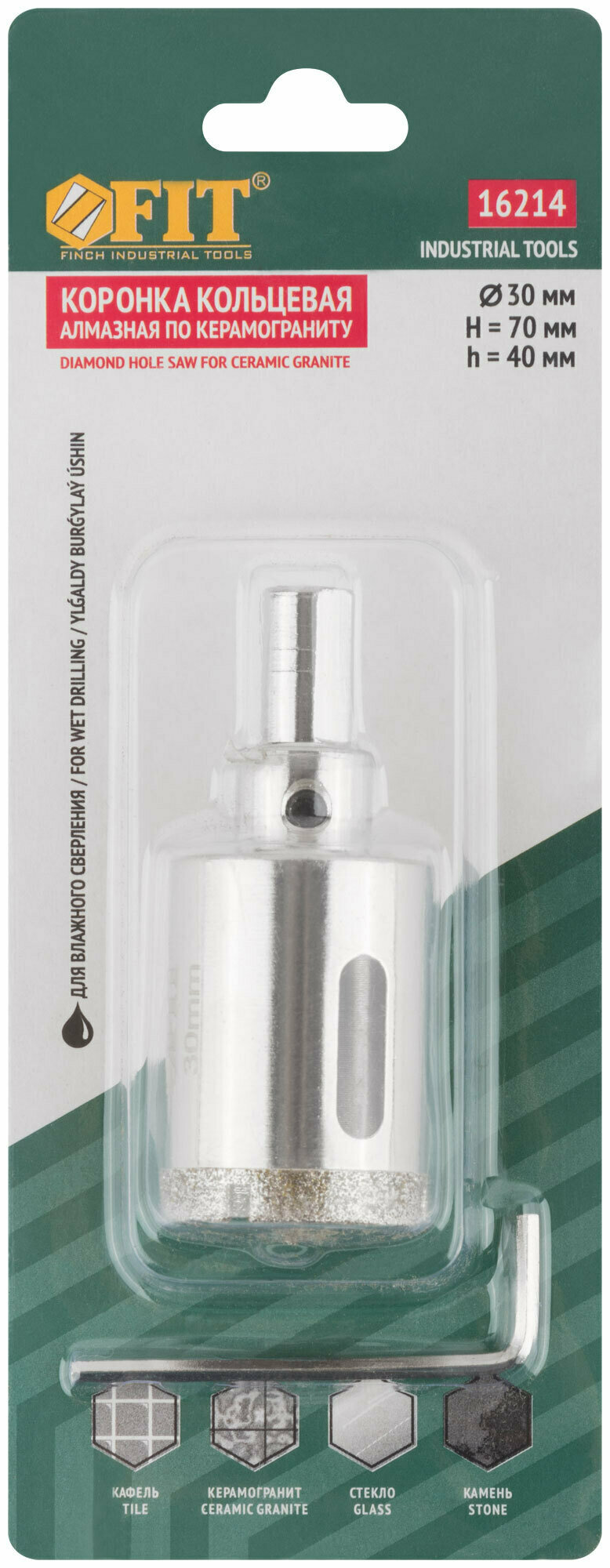 Коронка кольцевая по керамограниту, камню и кафелю алмазная с центровочным сверлом, для дрели, влажное сверление FIT 30х67 мм: сравнение цен, характеристики, фото, актуальное наличие и цены.