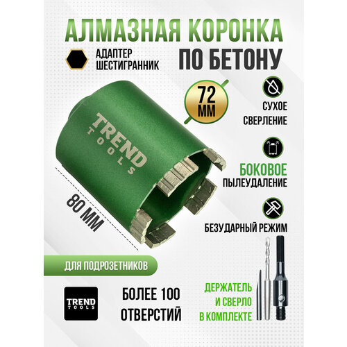 Купить Коронка по бетону и кирпичу алмазная Trend Tools 72 мм для подрозетников, держатель SDS Plus, верхнее пылеудаление с доставкой по всей России. Коронка по бетону и кирпичу алмазная Trend Tools 72 мм для подрозетников, держатель SDS Plus, верхнее пылеудаление: сравнение цен, характеристики, фото, актуальное наличие и цены.