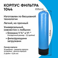 Корпус типоразмера 1044 для фильтров засыпного типа. Корпус на 100% устойчив к коррозии, имеет малый вес, но, в то же время, способен выдерживать высокое давление. корпуса- Высокопрочный композитный материал, армированный стекловолокном; - Изготовлен по бесшовной технологии; - Максимальная прочность и надежность резьбовых отверстий; - Материал внутреннего лайнераполиэтилен пищевого класса; - 100% устойчивость к ржавчине и коррозии. комплекта- Корпус 1044; - Центральная трубка для корпуса; - Нижний дистрибьютор, приклеенный к центральной трубке для корпуса. корпуса- Высота112 см - Диаметр основания26,8 см - Диаметр горловины2,5” - Вес корпуса6,54 кг - Общий внутренний объем корпуса48,8 л - Объем загрузки25л - Максимальное рабочее давление10 атм