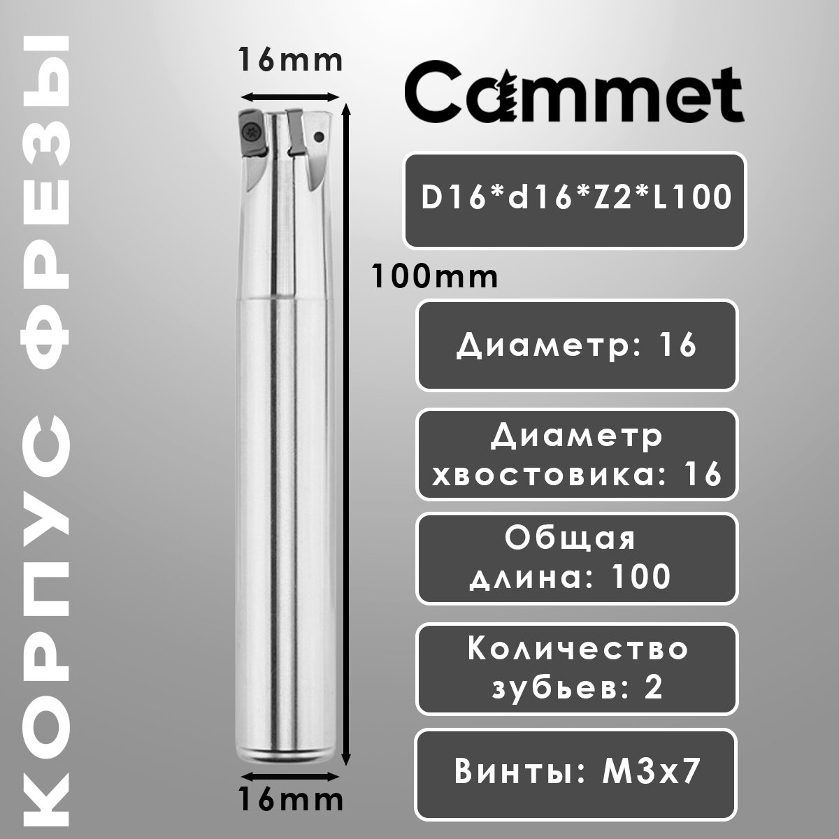 В комплект поставки входит 1 корпус фрезы, 2 болта М3, 1 ключ T8 и 1 упаковка. Общая длина фрезы составляет 100 мм, диаметр хвостовика - 16 мм, а диаметр корпуса - 16 мм.