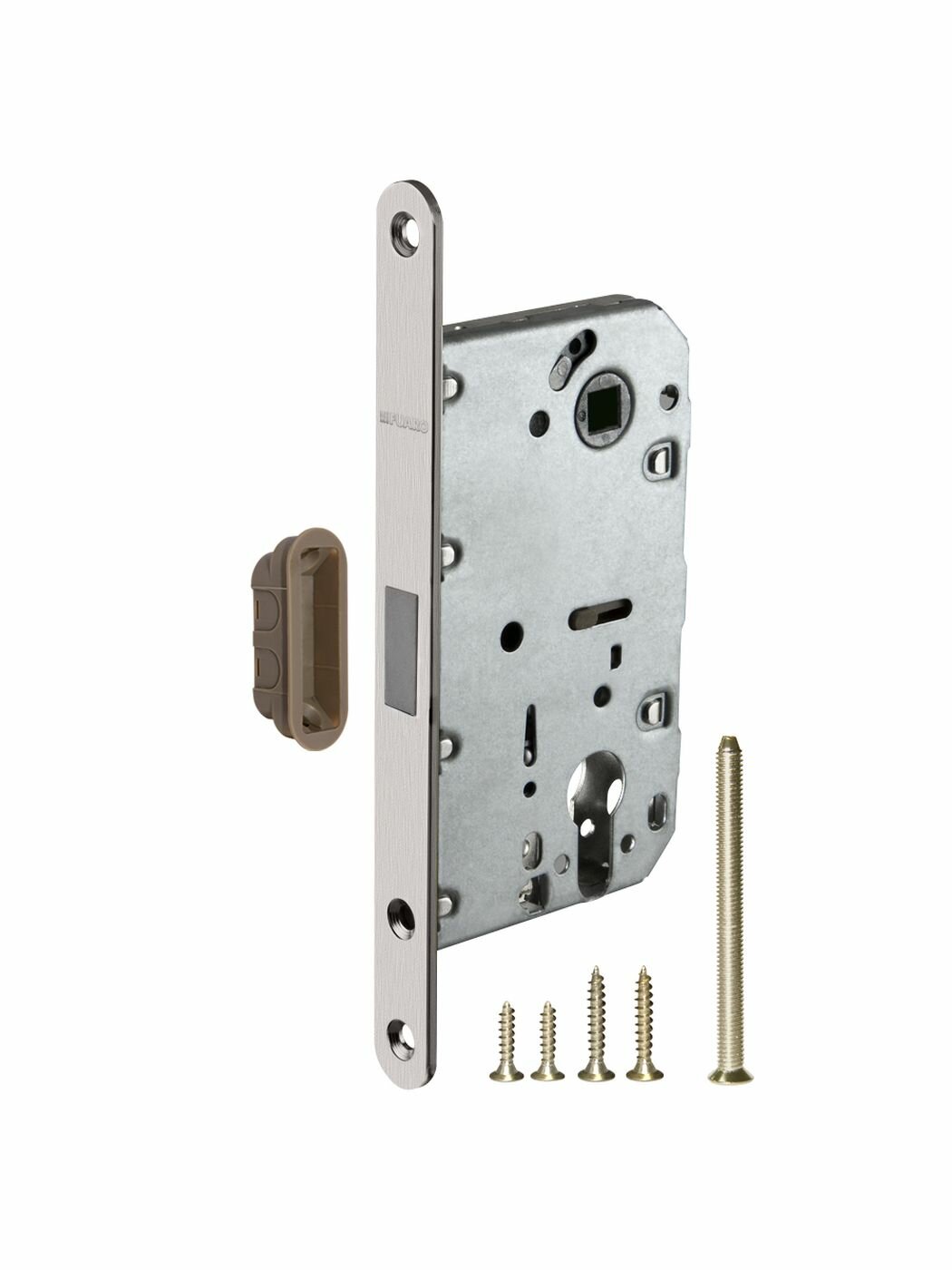 Корпус врезного замка Fuaro M85C серии MAGNET с магнитным механизмом изготовлен в соответствии с требованиями ГОСТ 5089-2003. Предназначена для установки в деревянные межкомнатные двери, подходит для дверей левого и правого открывания. Корпус выполнен из стали с надежным гальваническим покрытием. Магнитный механизм обеспечивает бесшумность работы защелки. Корпус врезного замка M85C с усиленной пружиной имеет высший 4 класс надежности (250 000 циклов открывания/закрывания). Отверстия под стяжные винты находятся на расстоянии 38 мм. Размер бэксета - 50 мм. Размер межосевого расстояния - 85 мм. Возможна установка дверных ручек на стяжные винты для более прочного крепления. Цвет: матовый никель. В комплектацию входят: ответная планка с магнитной вставкой и крепежная фурнитура в цвет изделия.