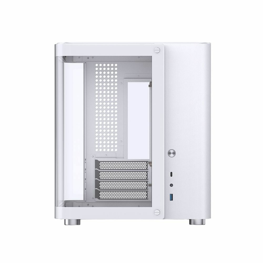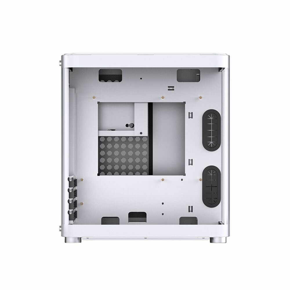 Корпус выполнен в белом цвете, что делает его визуально легким и воздушным. Боковая стенка и лицевая стенка изготовлены из стекла, что добавляет корпусу элегантности и позволяет наблюдать за работой компонентов.
