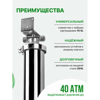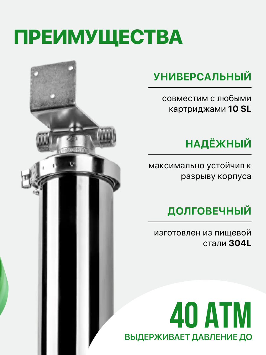 Фильтр магистральный Гейзер Премьер 10SL 3/4" устанавливается на вход в систему горячего или холодного водоснабжения. Корпус фильтра изготовлен из высококачественной нержавеющей стали марки 304L, устойчивой к возникновению коррозии, что гарантирует высокую надежность и многолетнюю работу фильтра.
