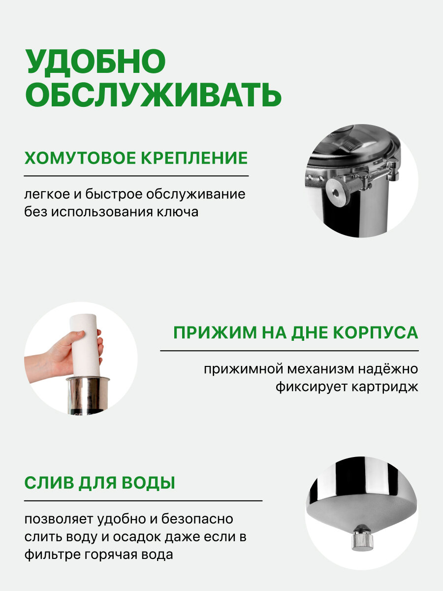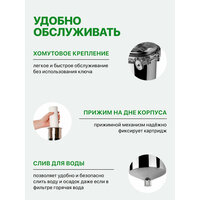 Корпус фильтра Гейзер Премьер 10SL 3/4" легко подключается к магистрали и легко обслуживается. Хомутовое крепление крышки позволяет легко извлечь картридж без использования дополнительных ключей. Также для замены картриджа предусмотрено удобное отверстие для слива воды.