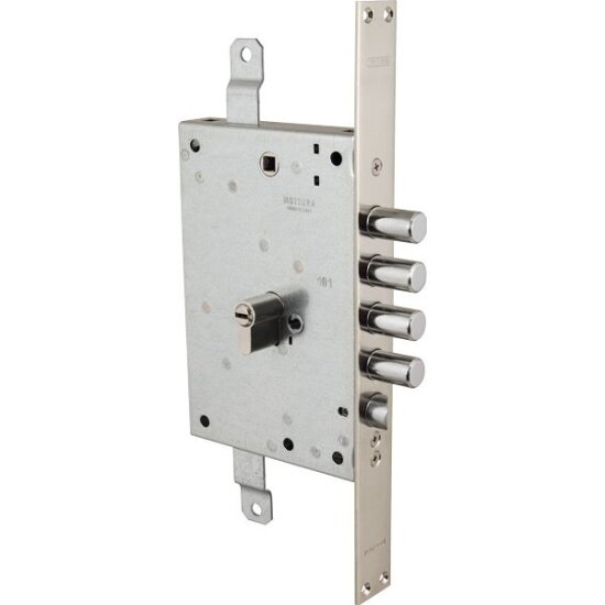 Корпус врезного замка 85.971 D с тремя точками запирания для цилиндрового механизма с защелкой предназначен для правосторонних дверей. Реверсивная защелка диаметром 20 мм приводится действием цилиндром и фалевой ручкой. Бэксет 63 мм. Ход 4 круглых ригелей диаметром 18 мм - 30 мм. Межосевое расстояние ригелей 28 мм. Ход тяг 20 мм.