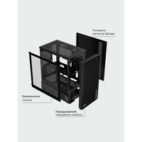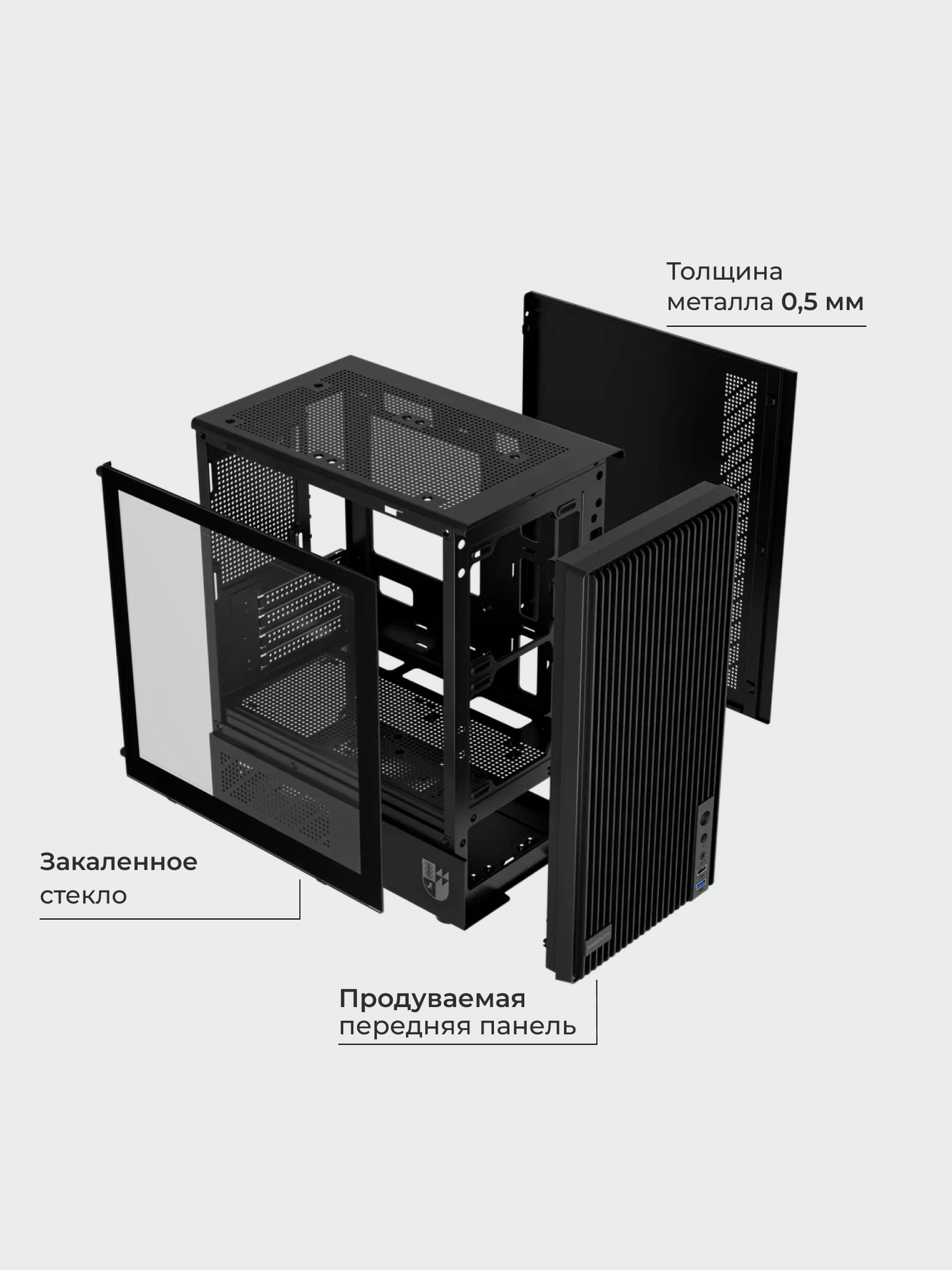 Корпус выполнен в черном цвете, что придает ему строгий и современный вид. Лицевая панель корпуса оснащена сетчатой структурой, что обеспечивает хорошую вентиляцию и позволяет воздуху свободно циркулировать внутри корпуса.