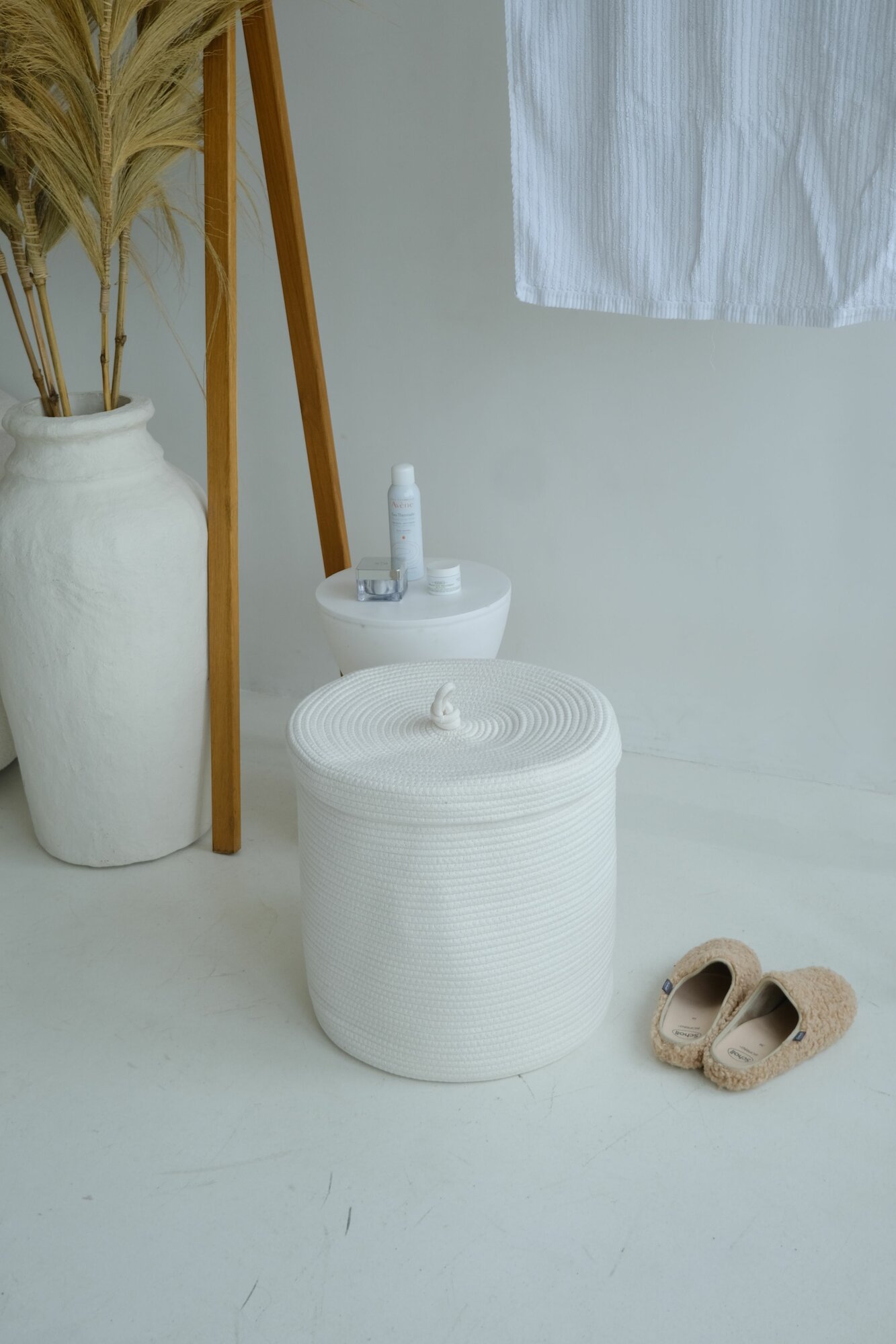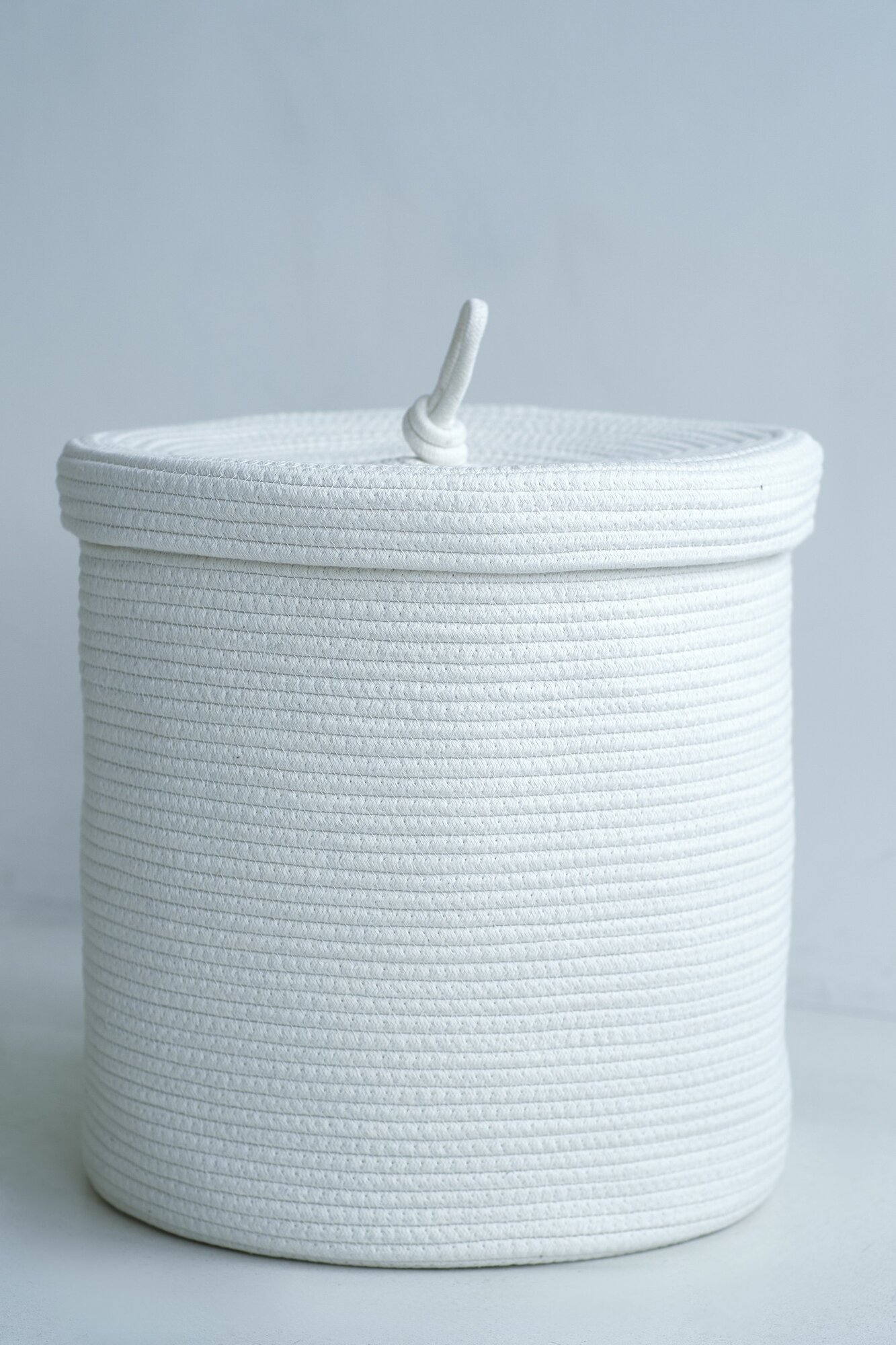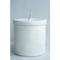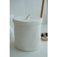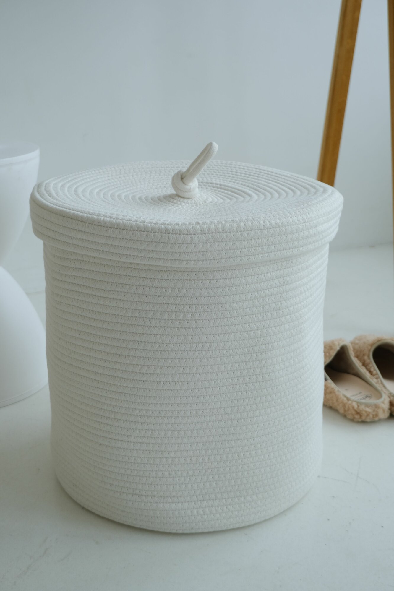 Корзина изготовлена из высококачественного полиэстера и хлопка, что обеспечивает ее долговечность и прочность. Она имеет круглую форму и с крышкой, которая предотвратит попадание грязи внутрь.
